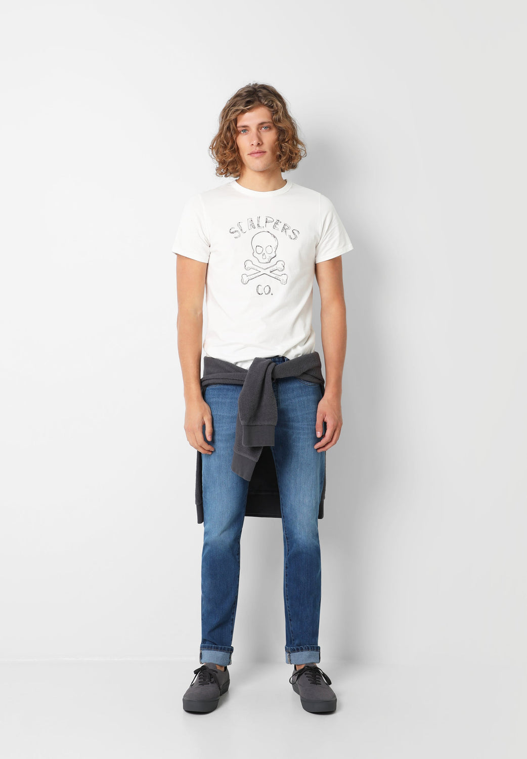 Polera con print frontal de calavera confeccionada en tejido 100% algodón. Corte Slim Fit, cuello redondo y manga corta. Detalle de etiqueta decorativa lateral.