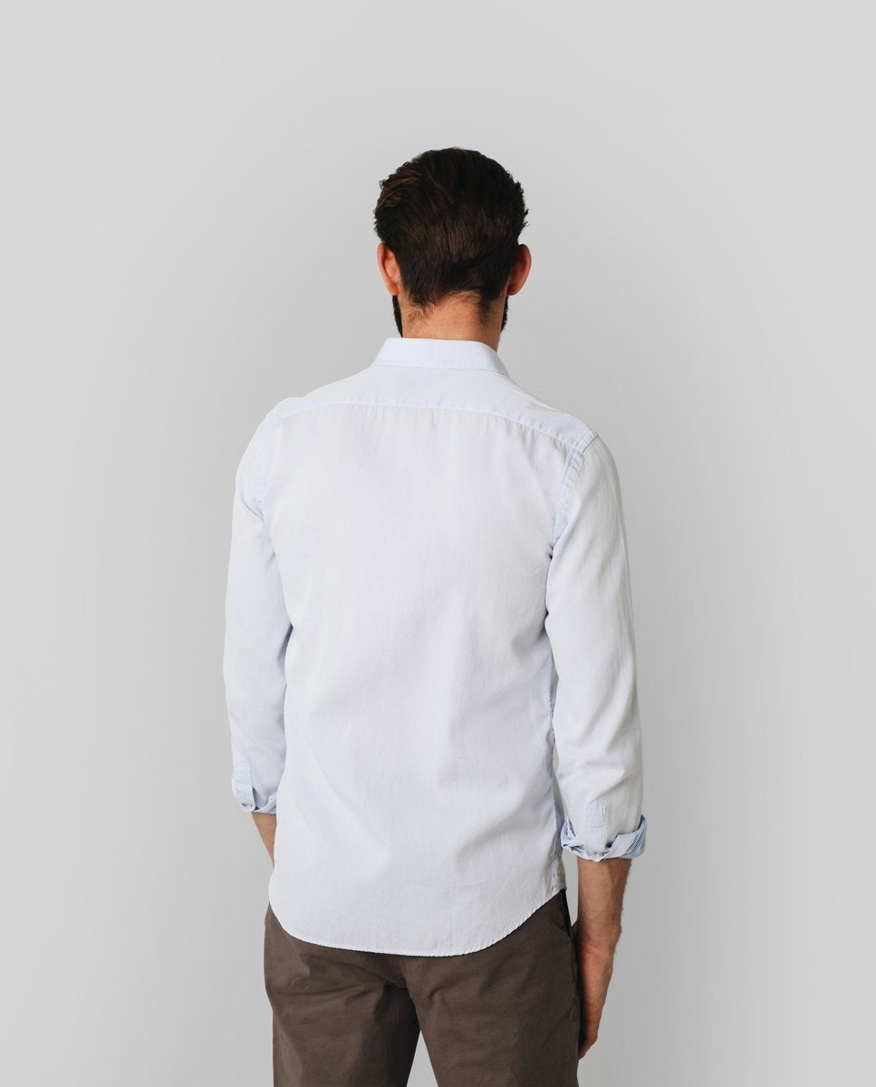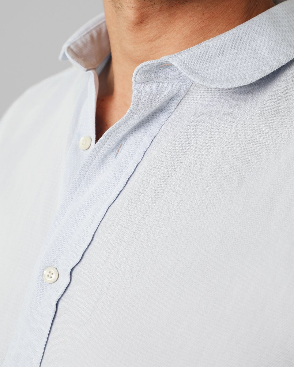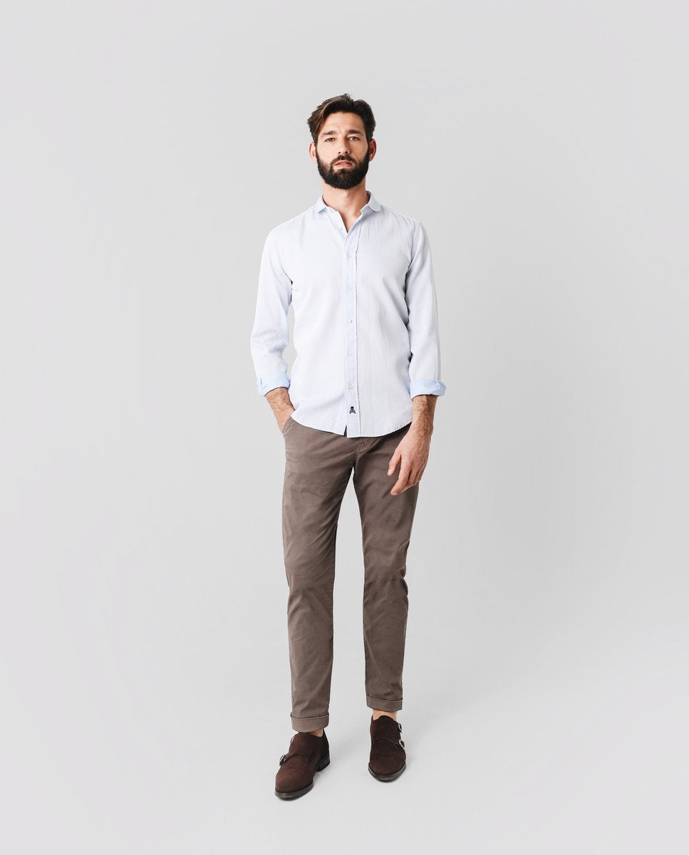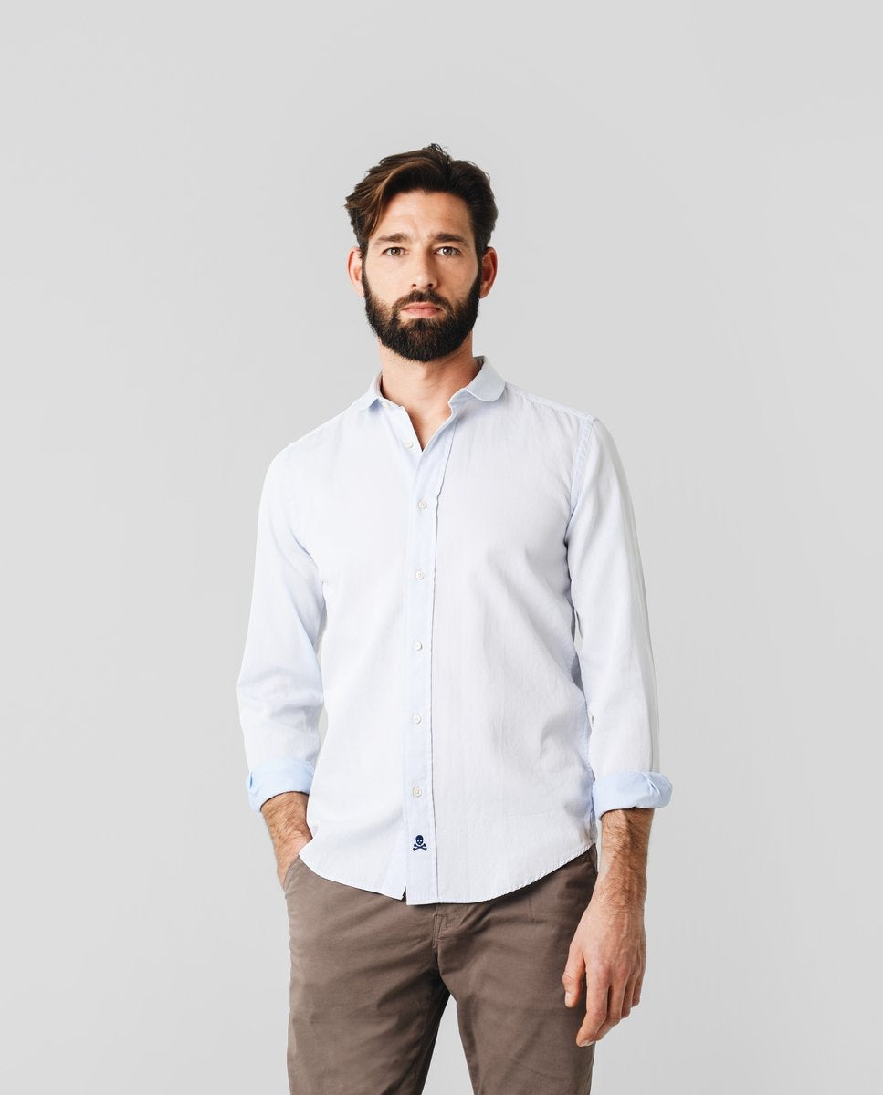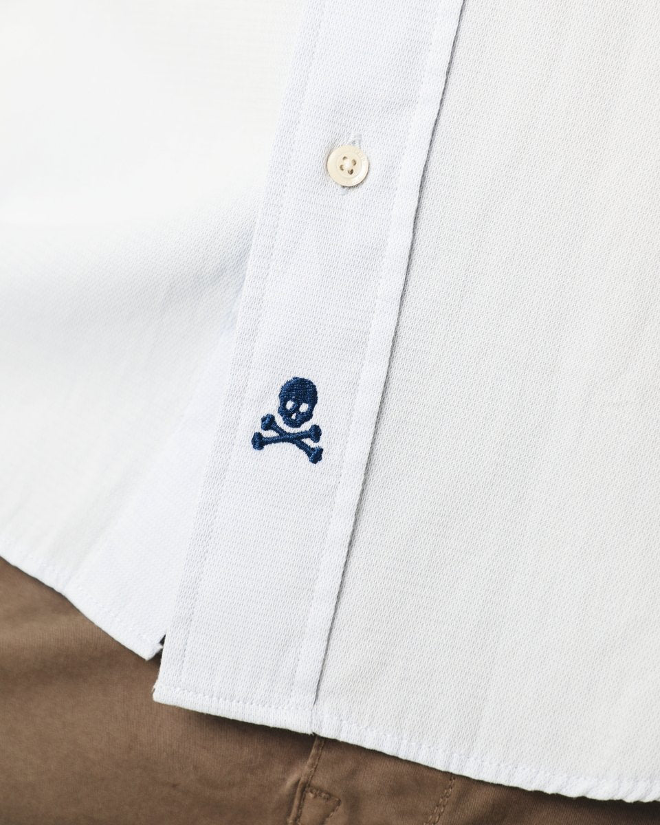 Camisa confeccionada en tejido algodón de estructura. Corte Regular Fit, cuello club y cierre con botones con tapeta de ancho especial. Manga larga terminada en puño simple y bolsillo en el pecho. Detalle de calavera bordada en el bajo.