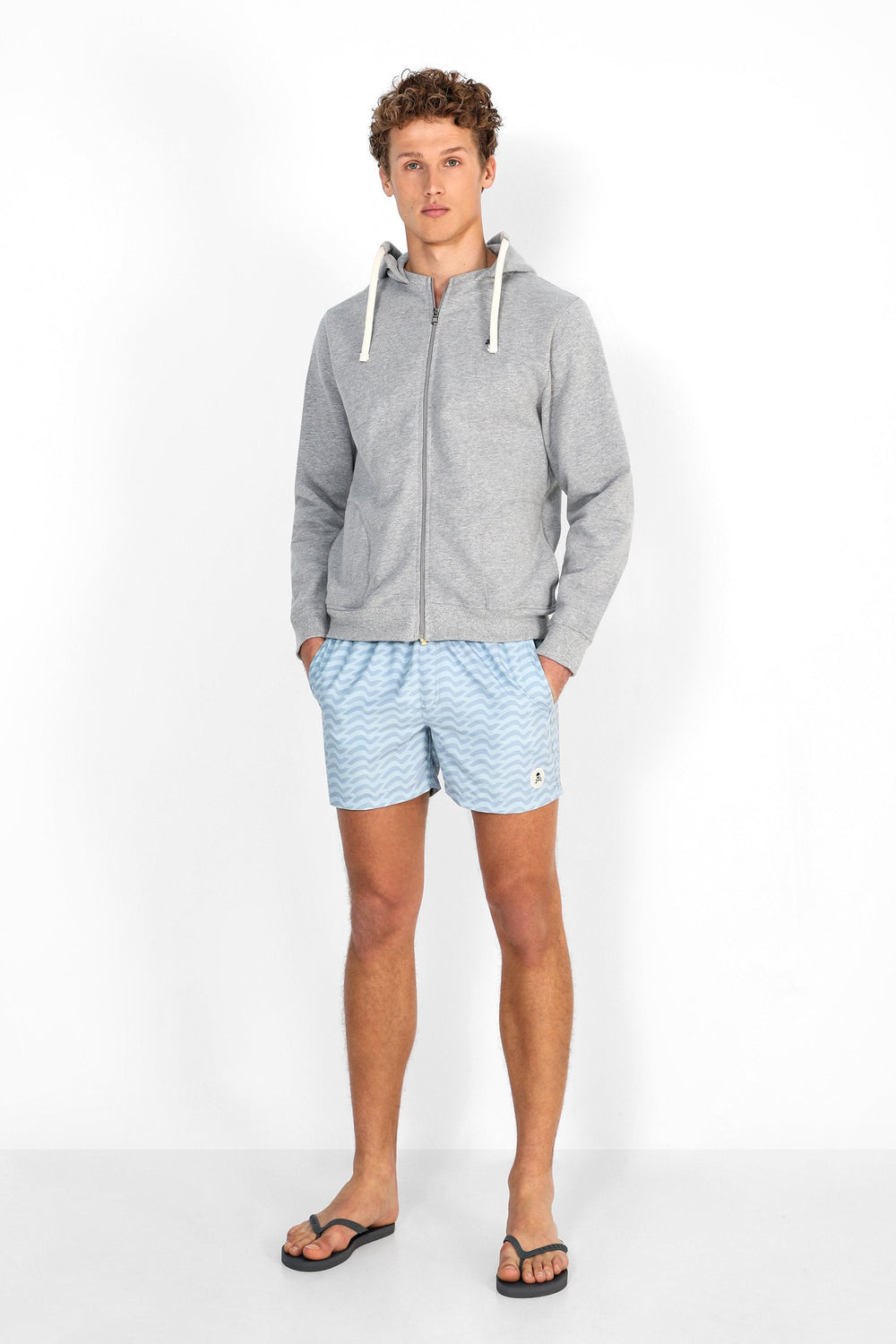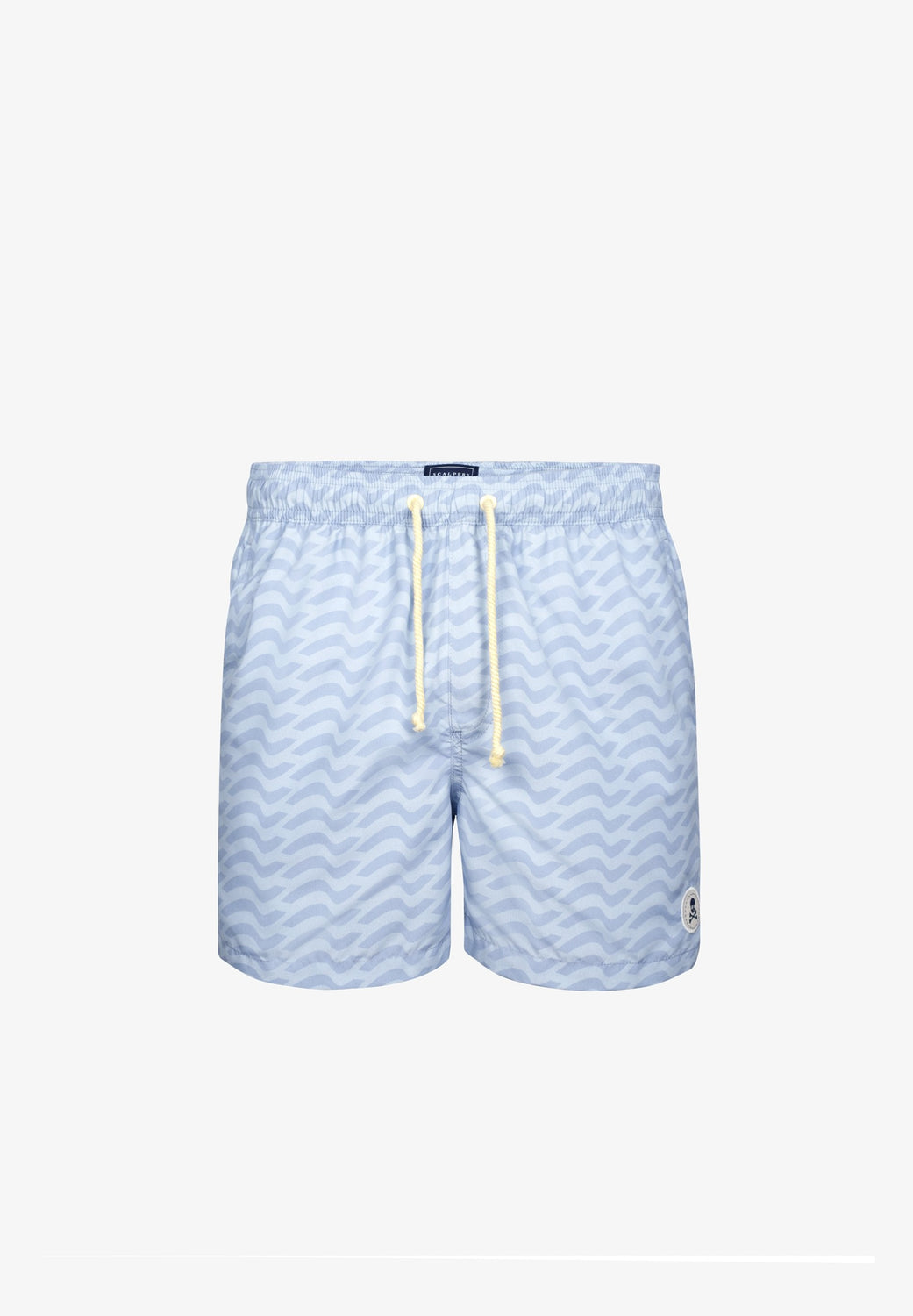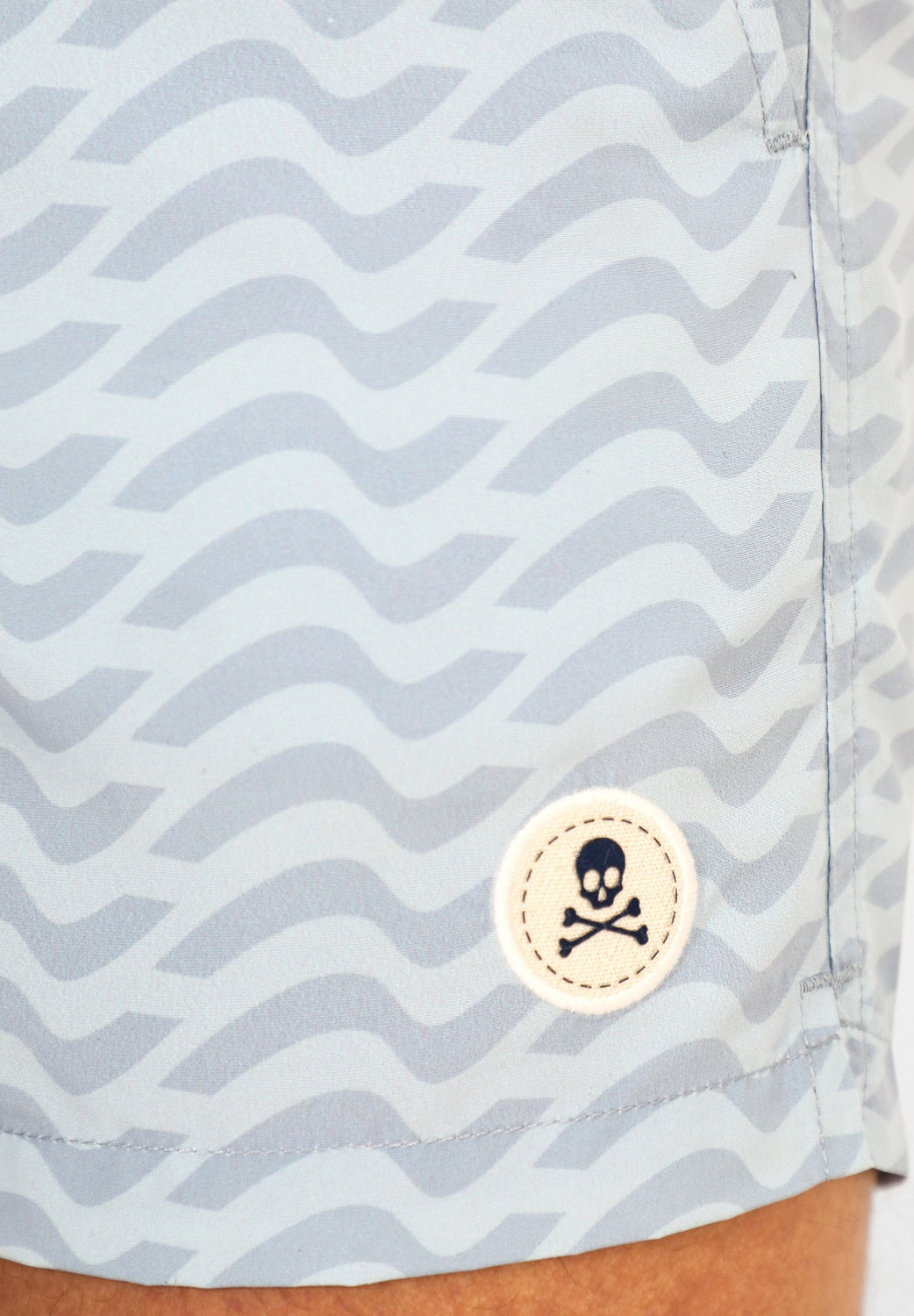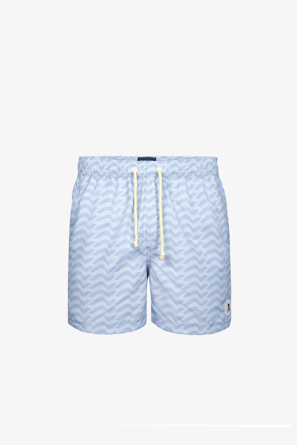 Bañador con estampado de ondas confeccionado en tejido de poliéster. Corte Regular Fit, cierre con cordón y velcro. Detalle de calavera engomada en el bajo y bolsillos laterales y trasero.