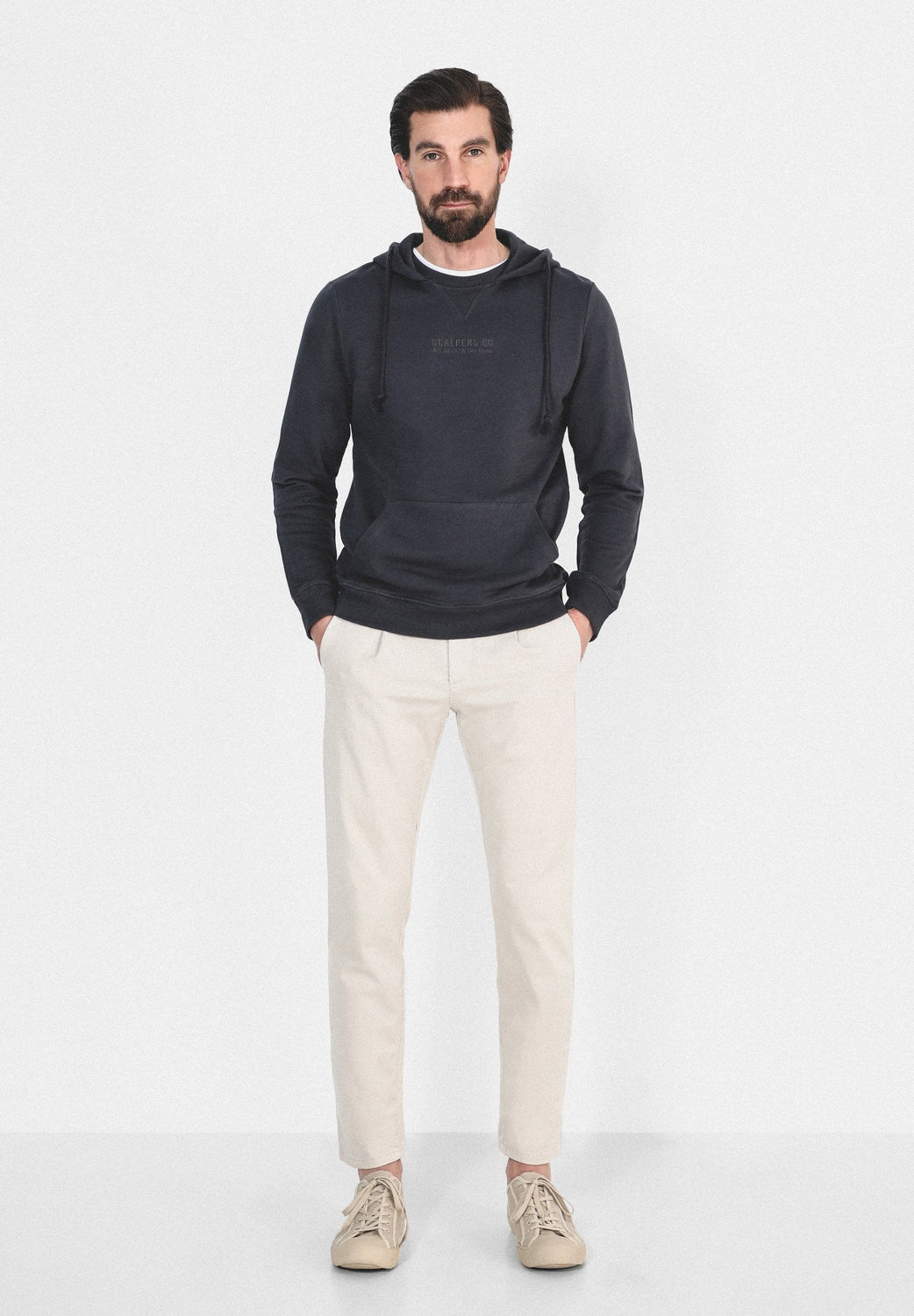 Sudadera confeccionada en tejido 100% algodón. Corte Regular Fit, cuello con capucha ajustable con cordón y manga larga. Bolsillo canguro y detalle de logo frontal.