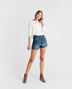 Pantalones cortos confeccionados en tejido denim. Corte con tiro alto y cierre cruzado. Bolsillos laterales y traseros. Tiene trabillas.