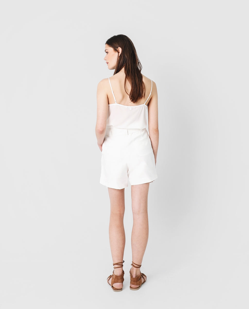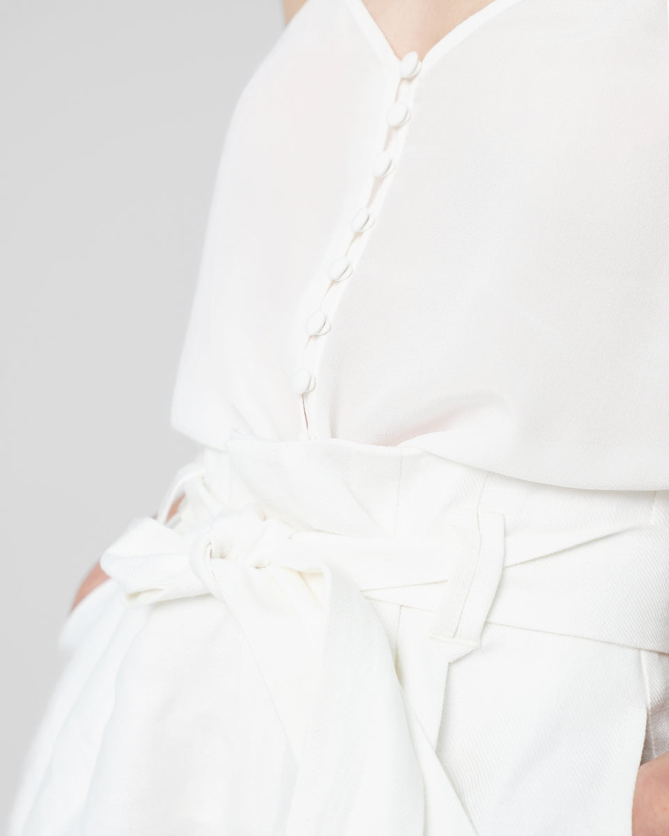 Pantalón corto confecciondo en tejido 100% lino premium. Corte ancho con tiro alto, cierre con lazada y bolsillos laterales.