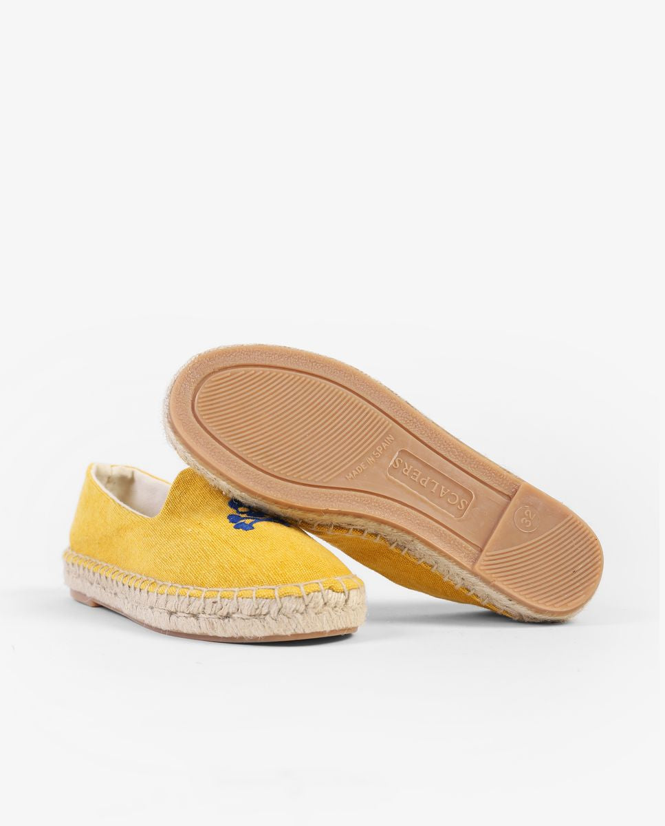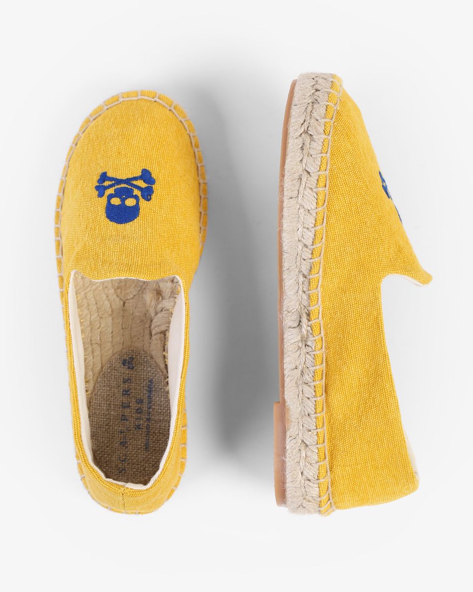 Espadrilles de canvas lavado con bordado de calavera en hilo mate frontal, confeccionada en tejido de algodón. La suela es de yute con la planta del pie de goma. Disponible en tres colores.