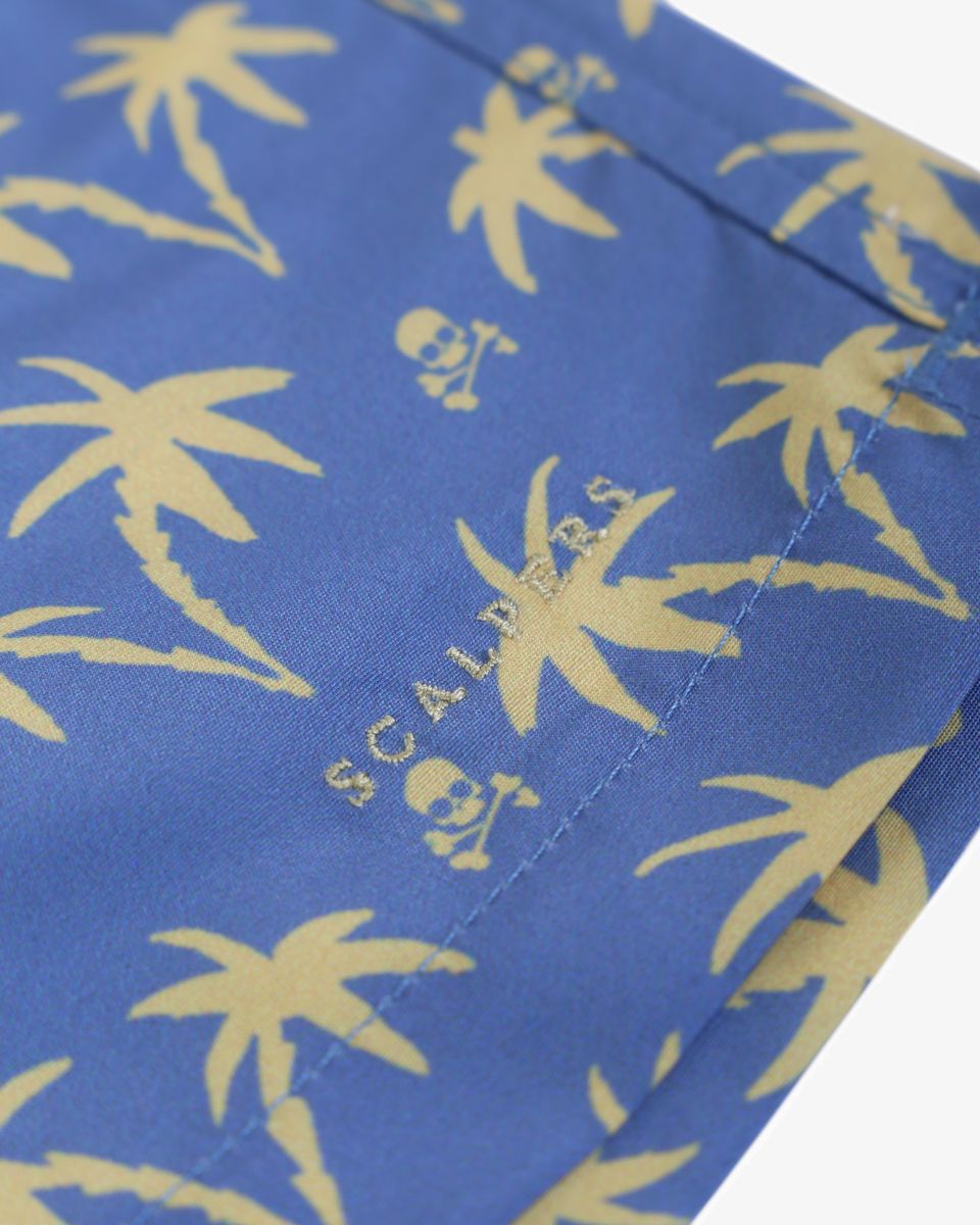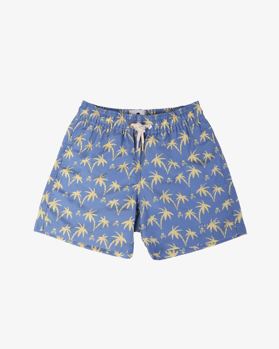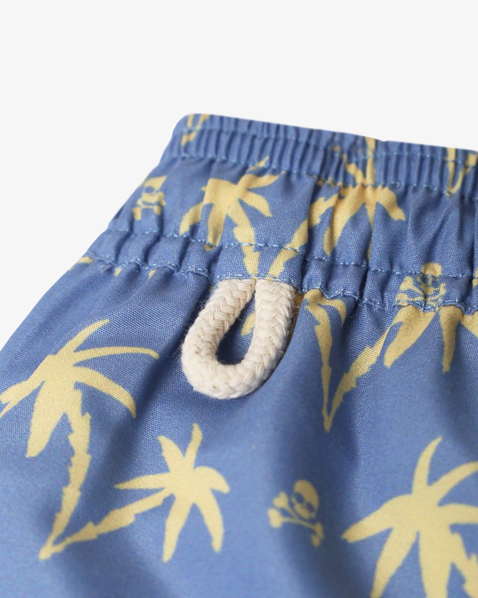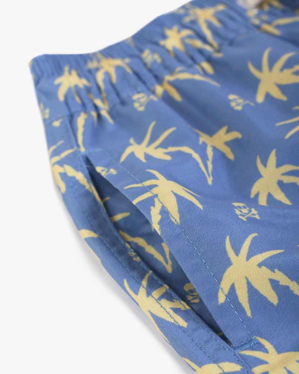 Bañador con estampado de palmeras a contraste. Corte recto, cinturilla elástica ajustable con cordón, dos bolsillos laterales y uno trasero con cierre de velcro. Disponible en varios colores.