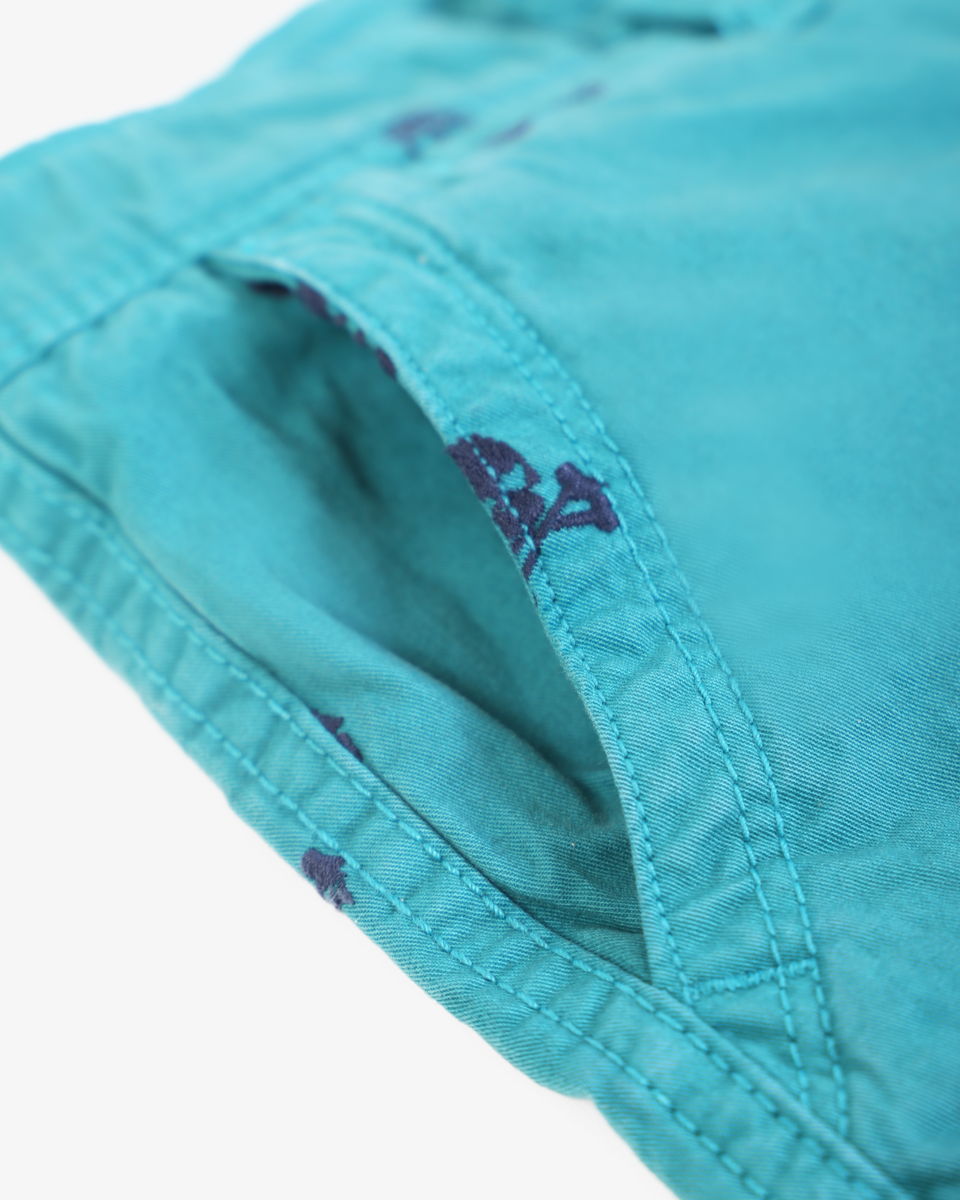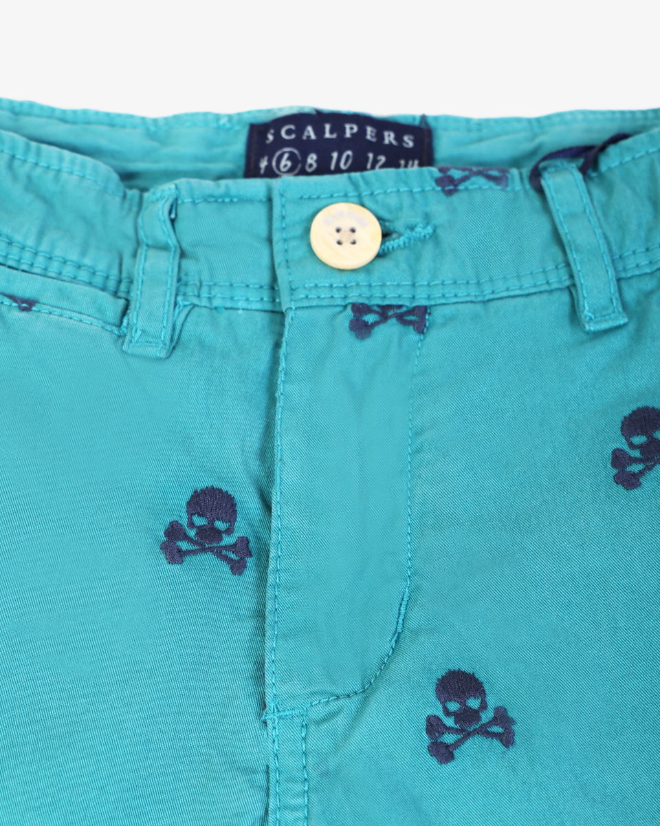 Bermudas con bordado de calaveras a contraste, confeccionadas en tejido 100% algodón. Corte recto con cinturilla ajustable, cierre con botón y cremallera y bolsillos laterales. Tiene trabillas, detalle de los pespuntes muy marcados y el bordado del logotipo a contraste. Disponible en varios colores.