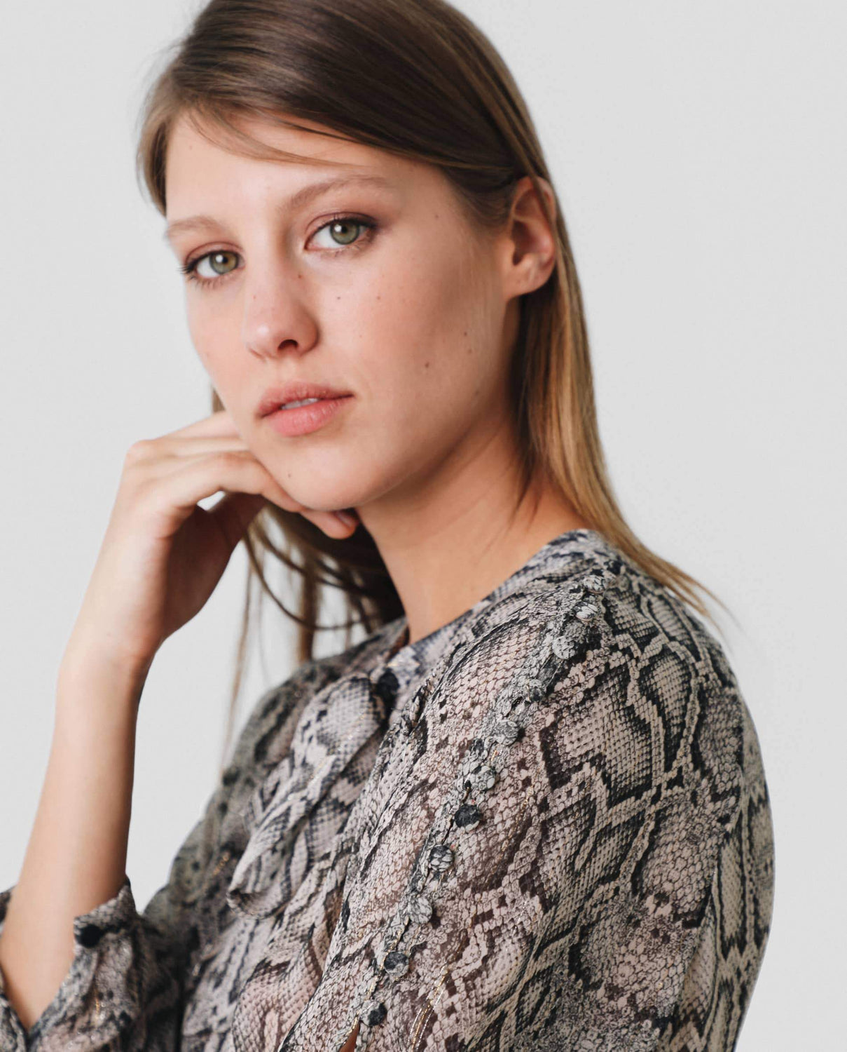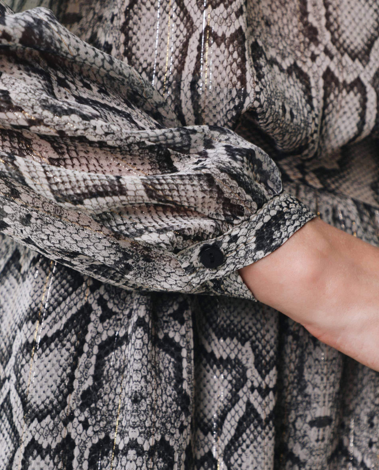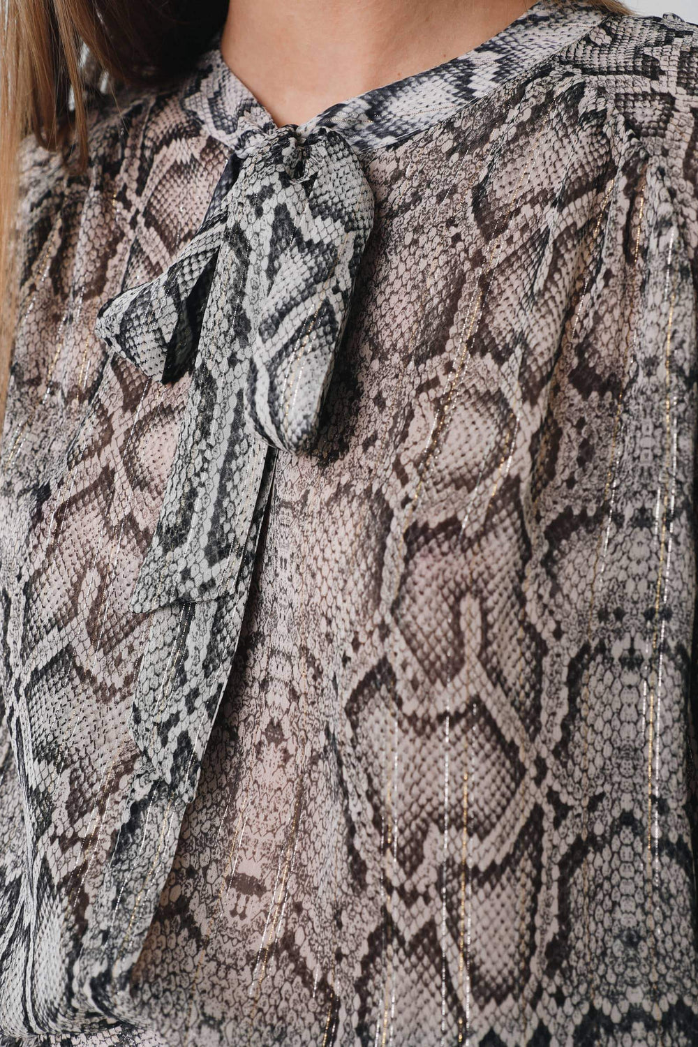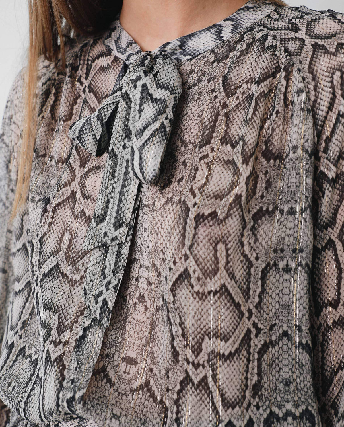 Camisa semitransparente con estampado animal confeccionada en tejido con lurex. Corte Regular Fit, cuello con lazada y detalle de botones forrados del mismo tejido en el hombro.