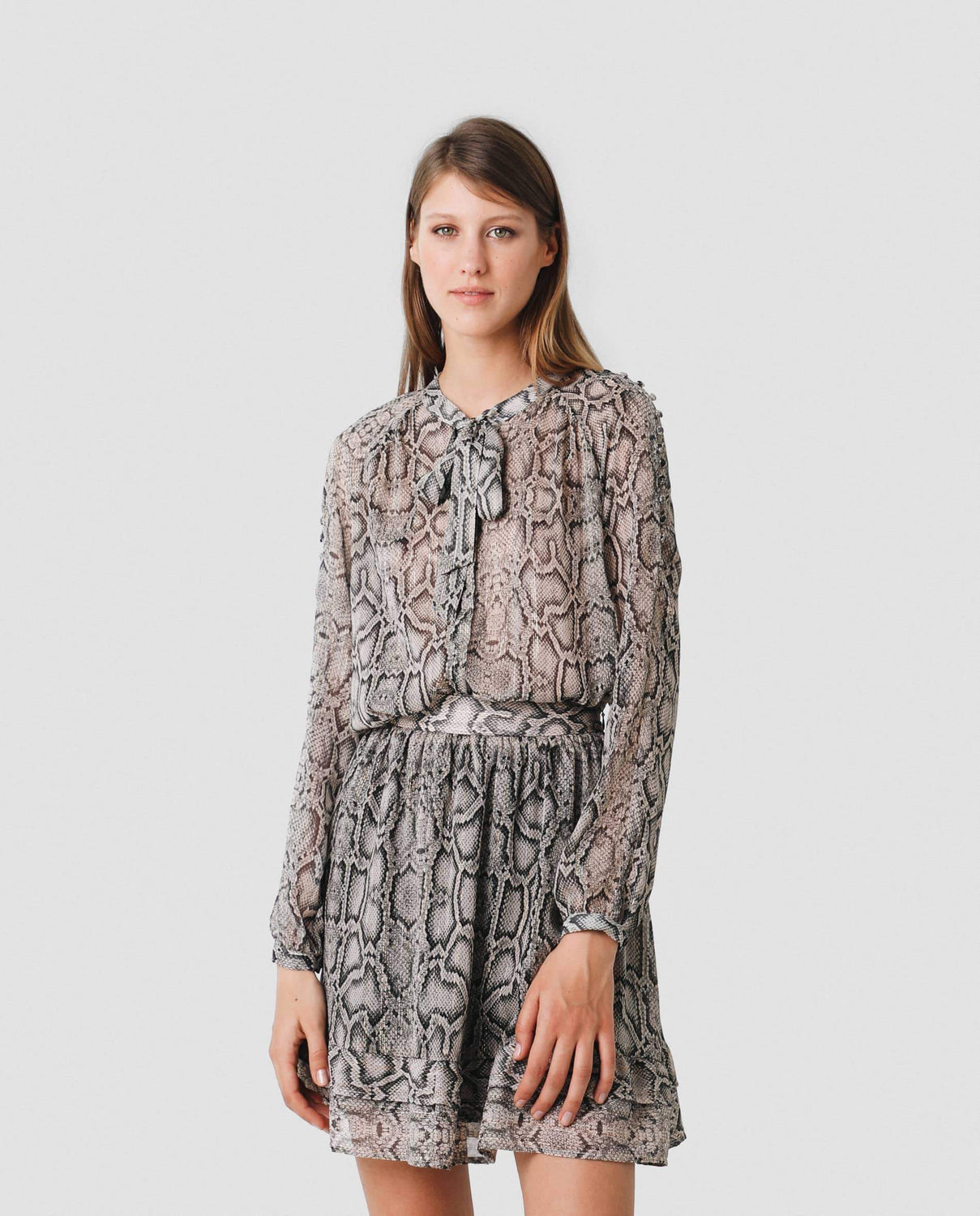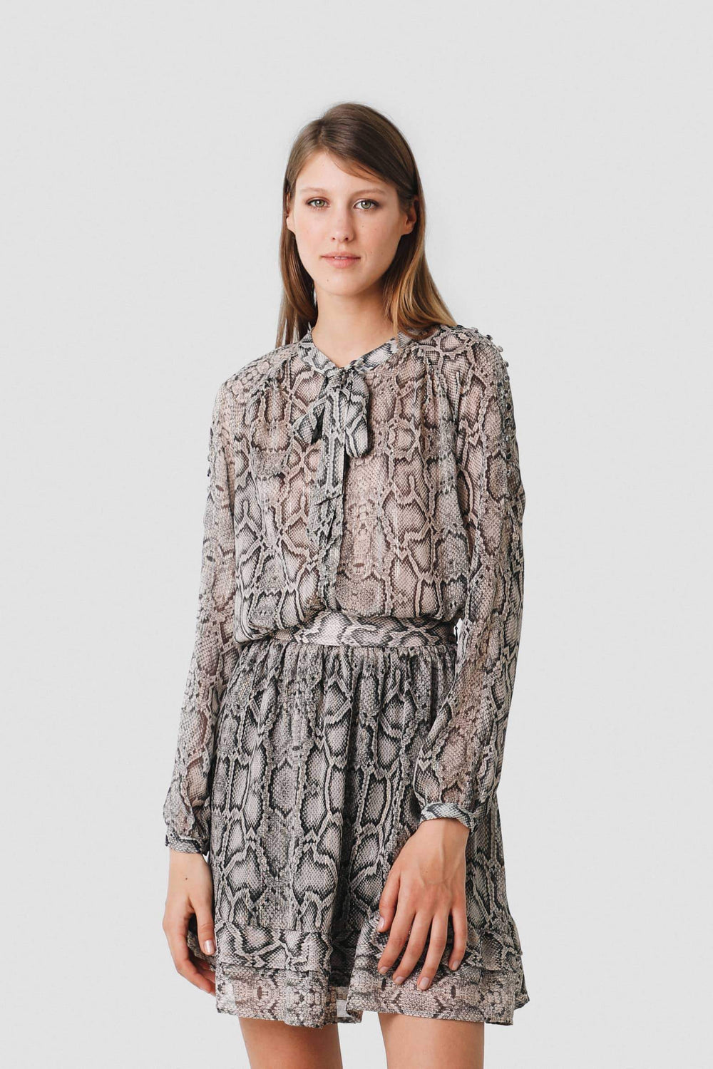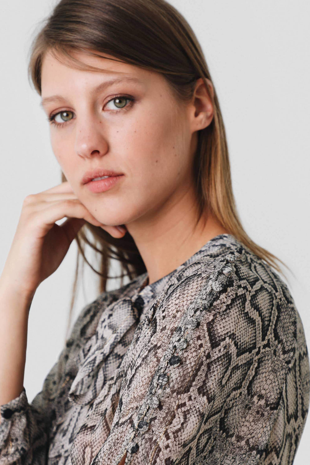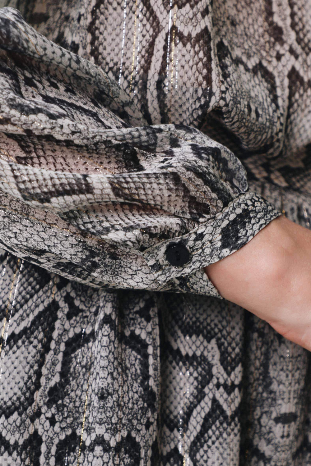 Camisa semitransparente con estampado animal confeccionada en tejido con lurex. Corte Regular Fit, cuello con lazada y detalle de botones forrados del mismo tejido en el hombro.