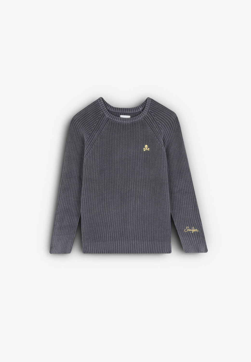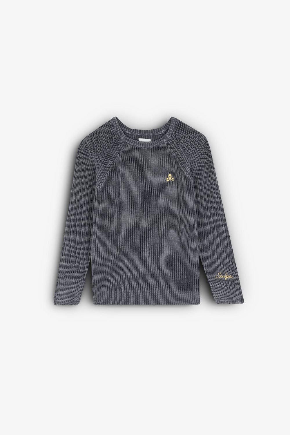 Jersey de punto inglés con efecto lavado y detalle de calavera bordada en pecho a contraste.