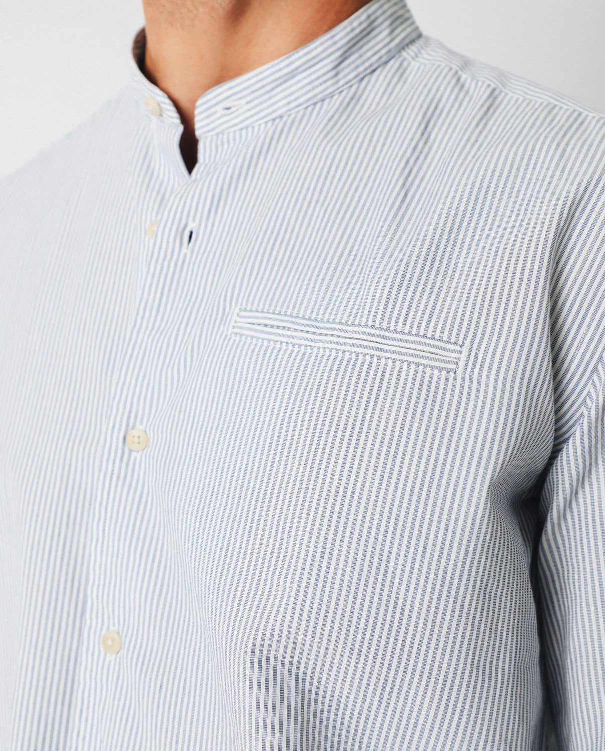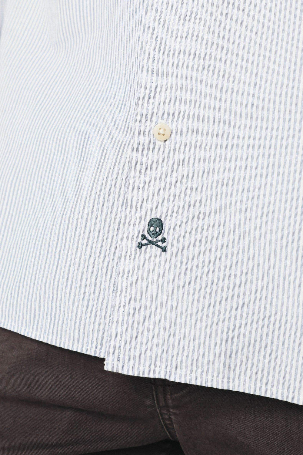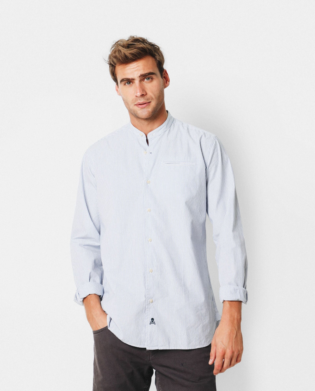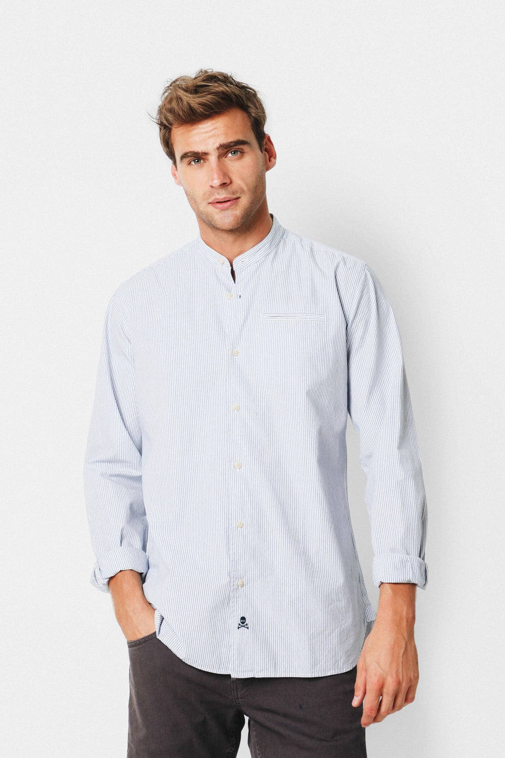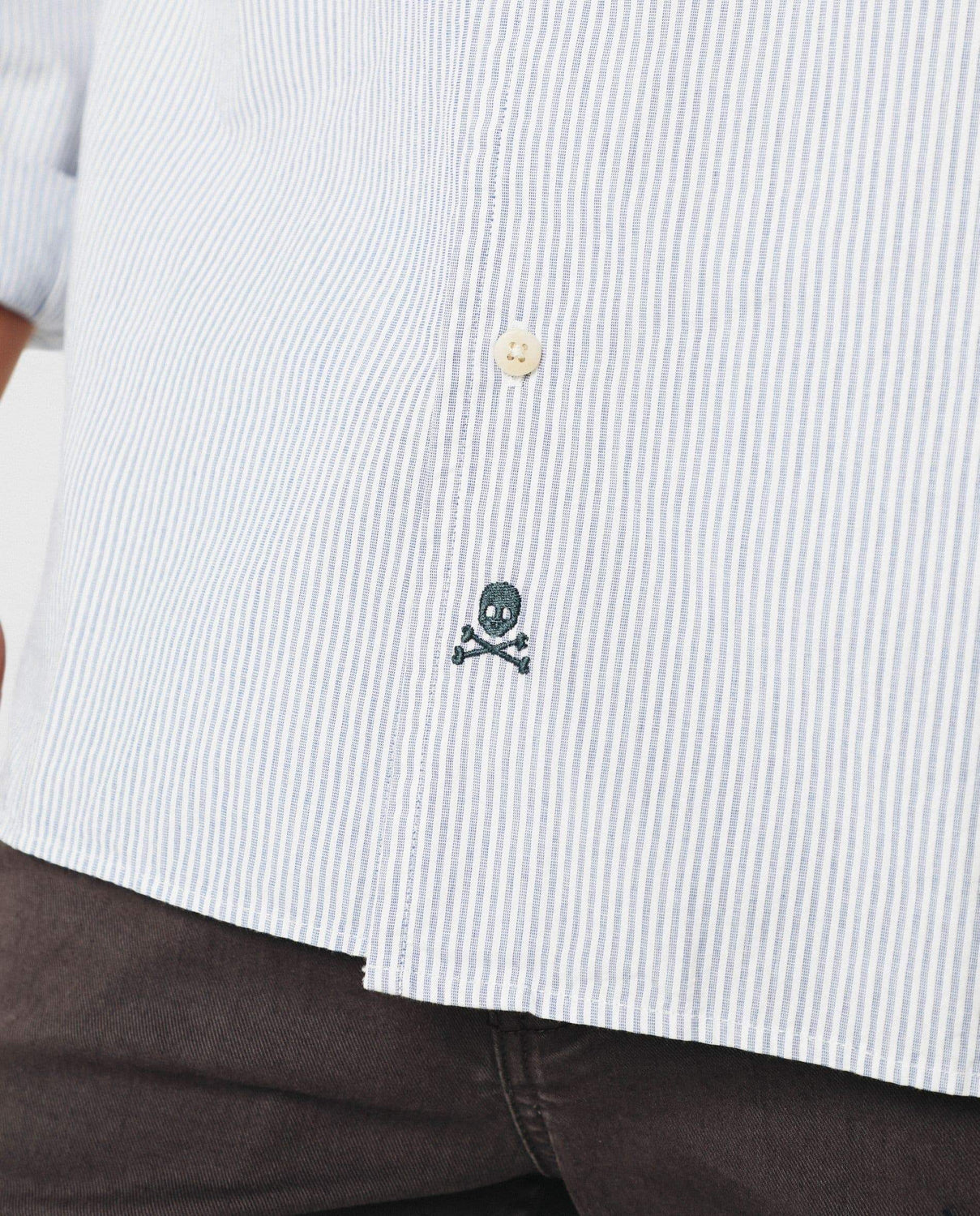 Camisa de rayas confeccionada en tejido 100% algodón. Corte Regular Fit, cuello mao y cierre con botones. Manga larga terminada en puño y bolsillo insertado en el pecho. Detalle de calavera bordada en el bajo.
