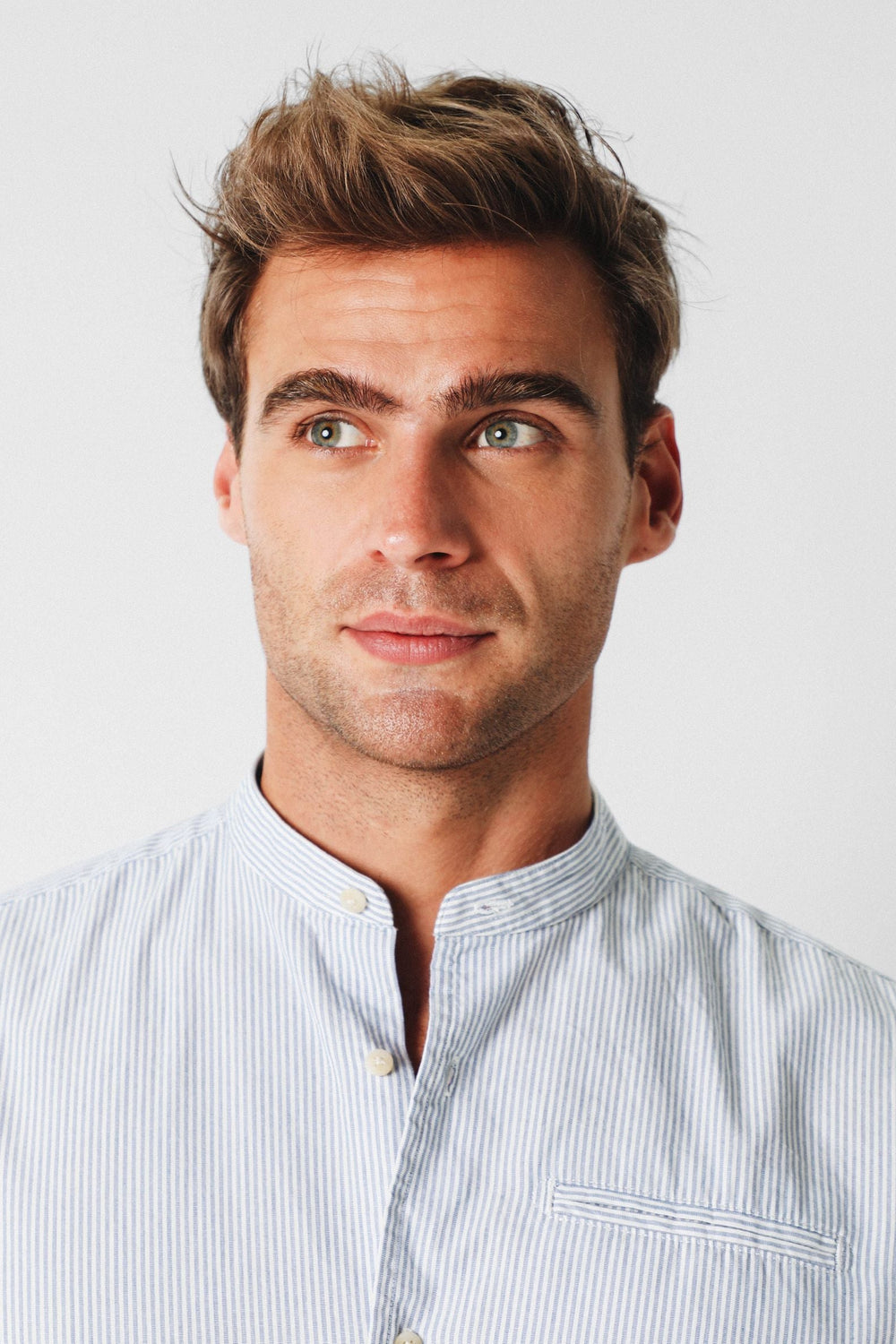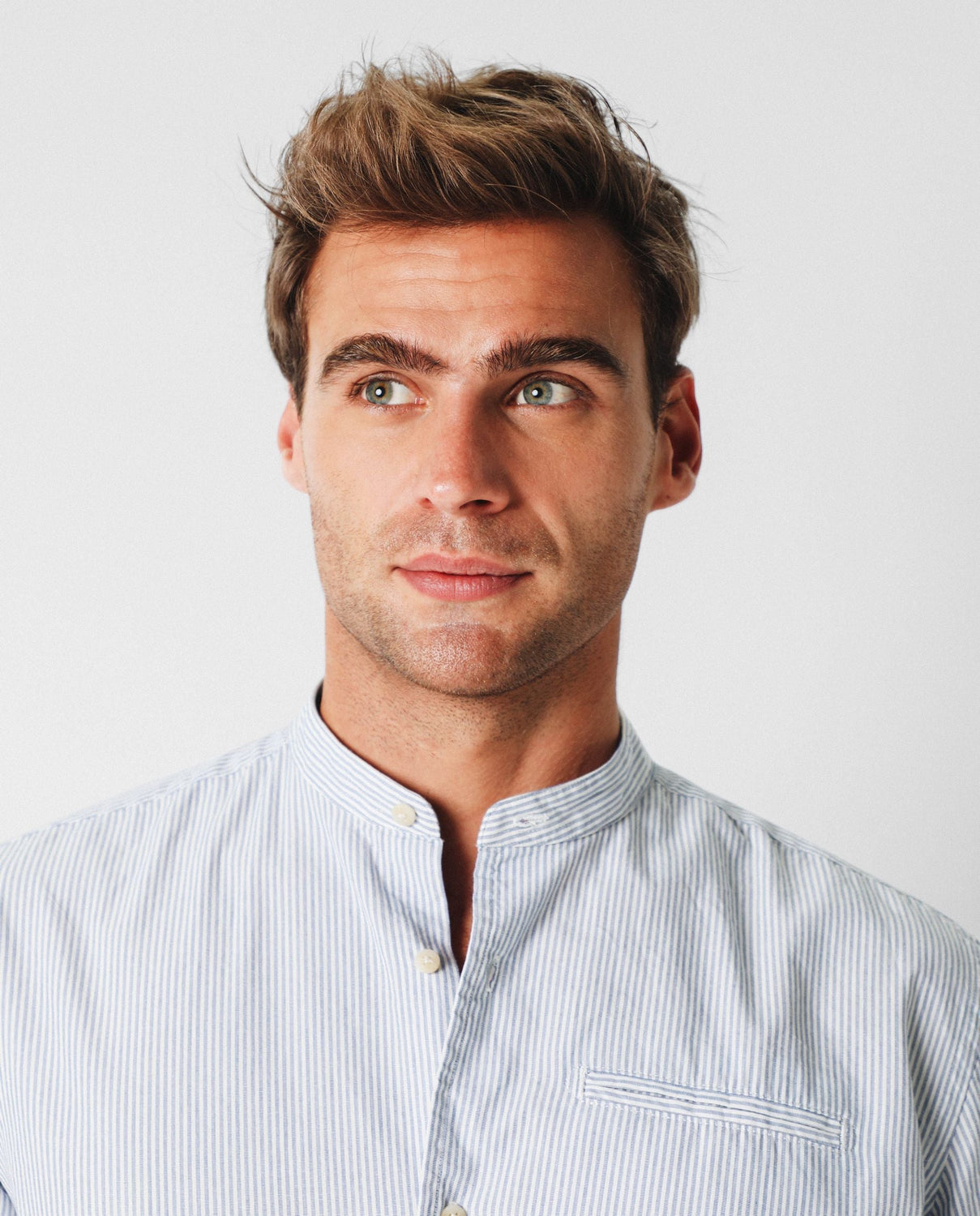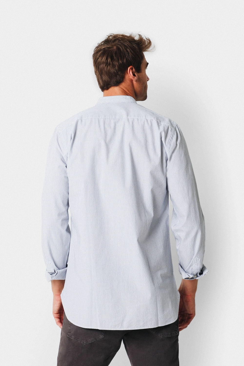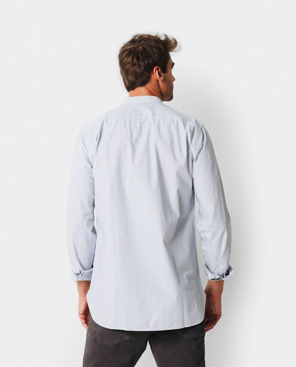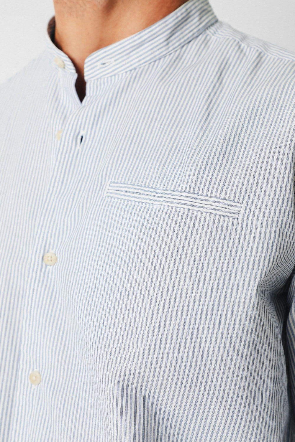 Camisa de rayas confeccionada en tejido 100% algodón. Corte Regular Fit, cuello mao y cierre con botones. Manga larga terminada en puño y bolsillo insertado en el pecho. Detalle de calavera bordada en el bajo.