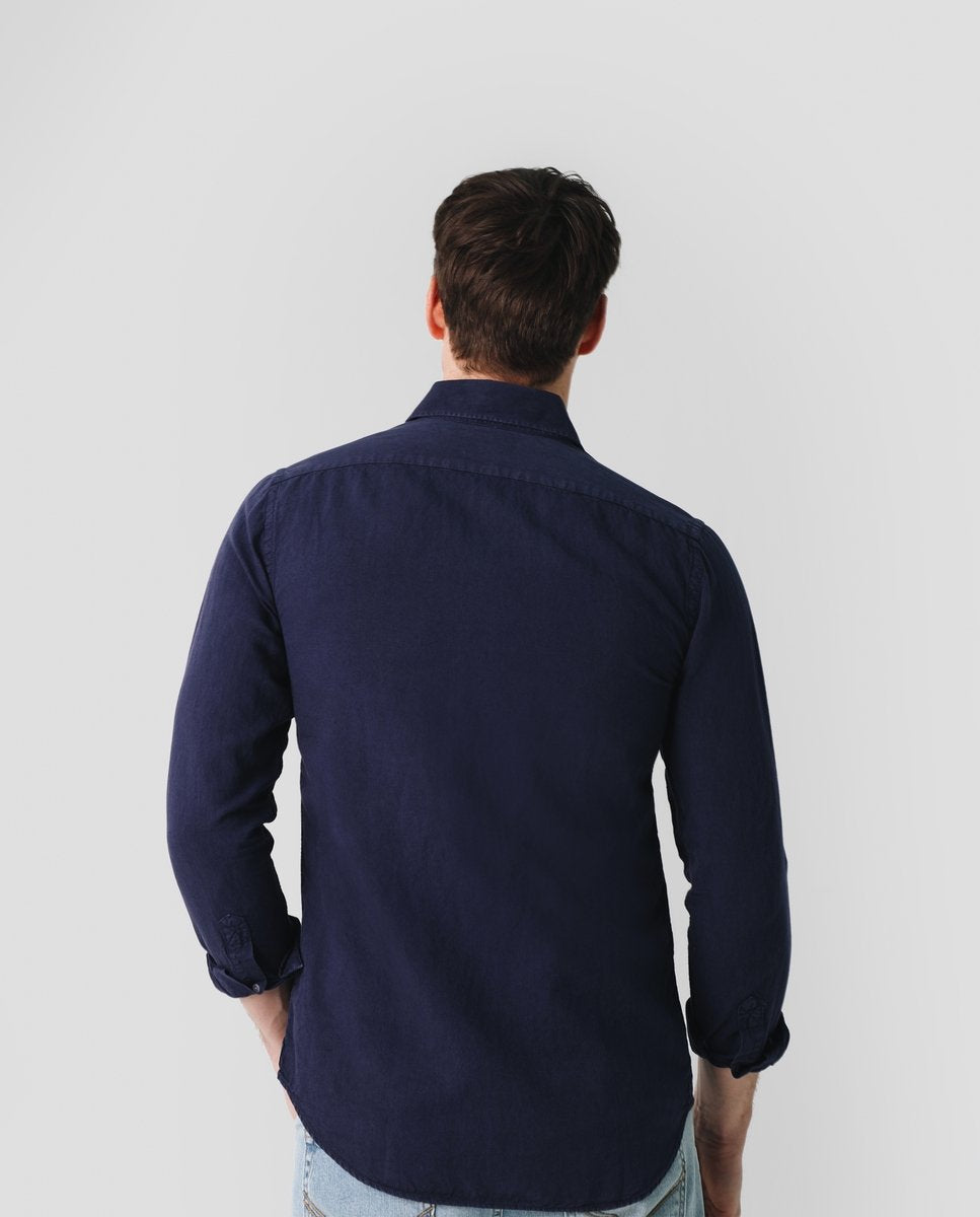 Camisa confeccionada en lino. Corte Regular Fit, cuello sport con ballenas y cierre con botones. Manga larga terminada en puño simple y detalle de calavera bordada en el pecho a tono. Disponible en cinco colores.
