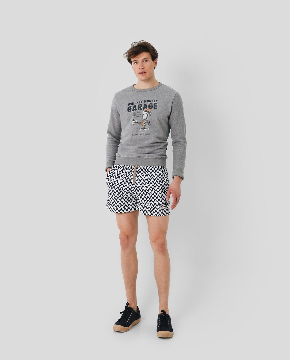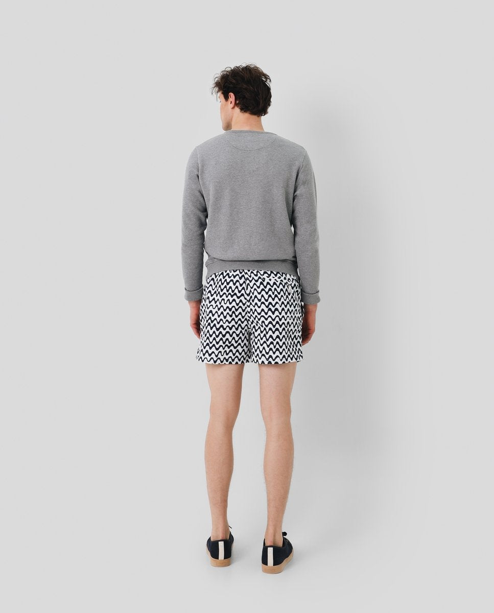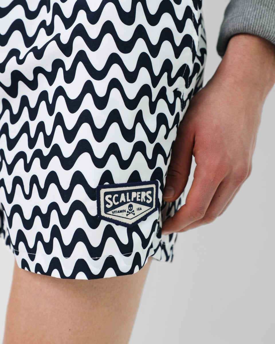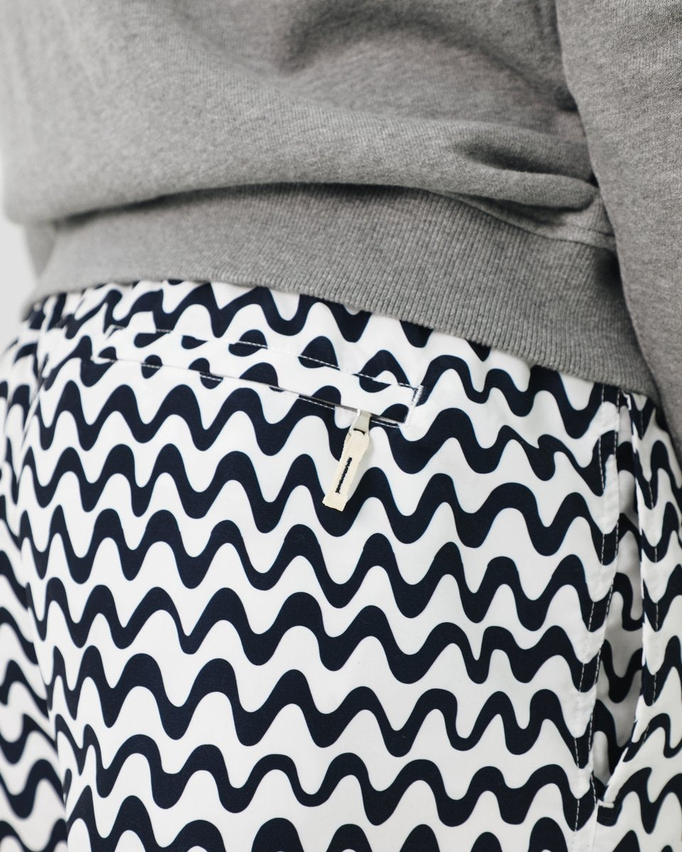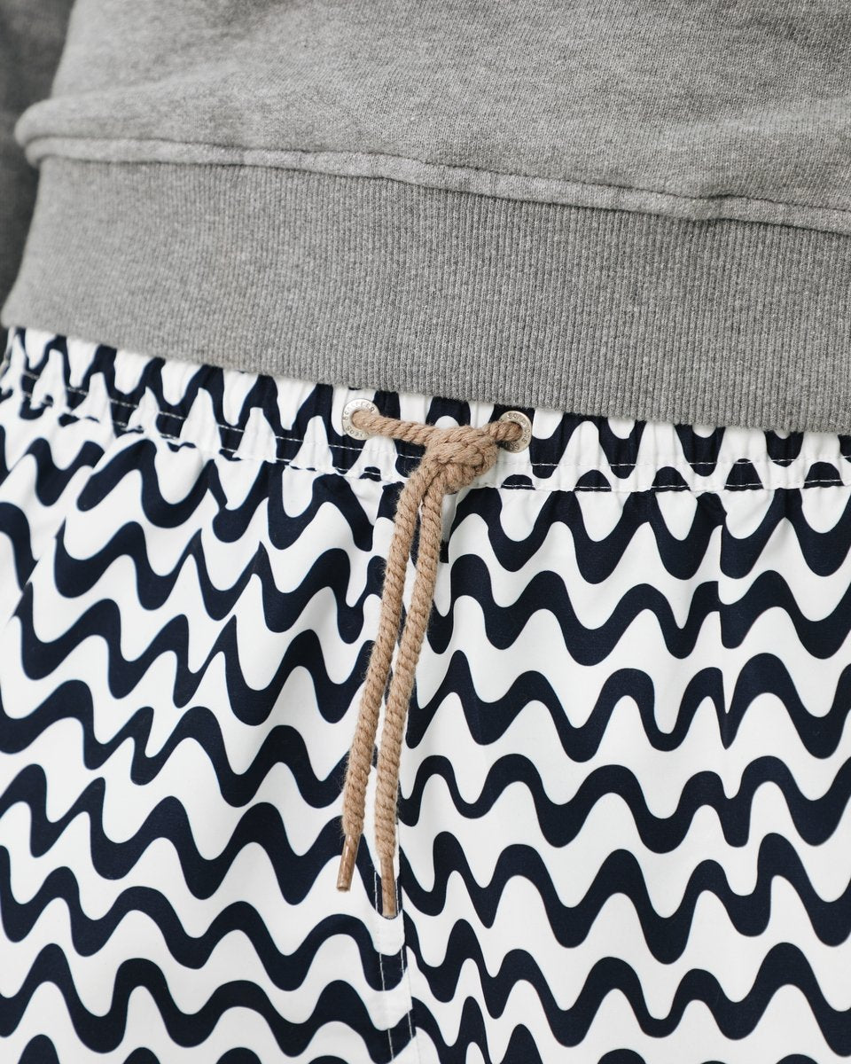 Bañador con estampado de ondas. Cintura elástica y cierre con cordón. Tiene dos bolsillos laterales y un parche en el bajo. Disponible en cuatro colores.