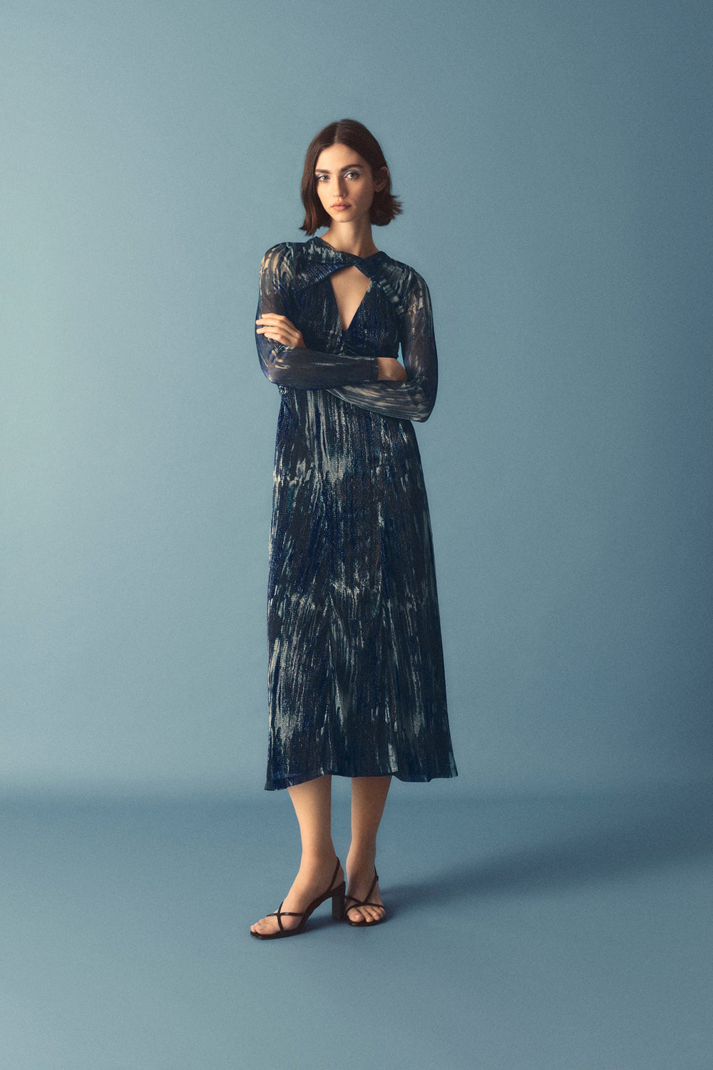 Vestido midi con print confeccionado en tejido de lurex. Slim fit, cuello redondo con abertura en escote y cierre trasero. Manga larga y frunce delantero.