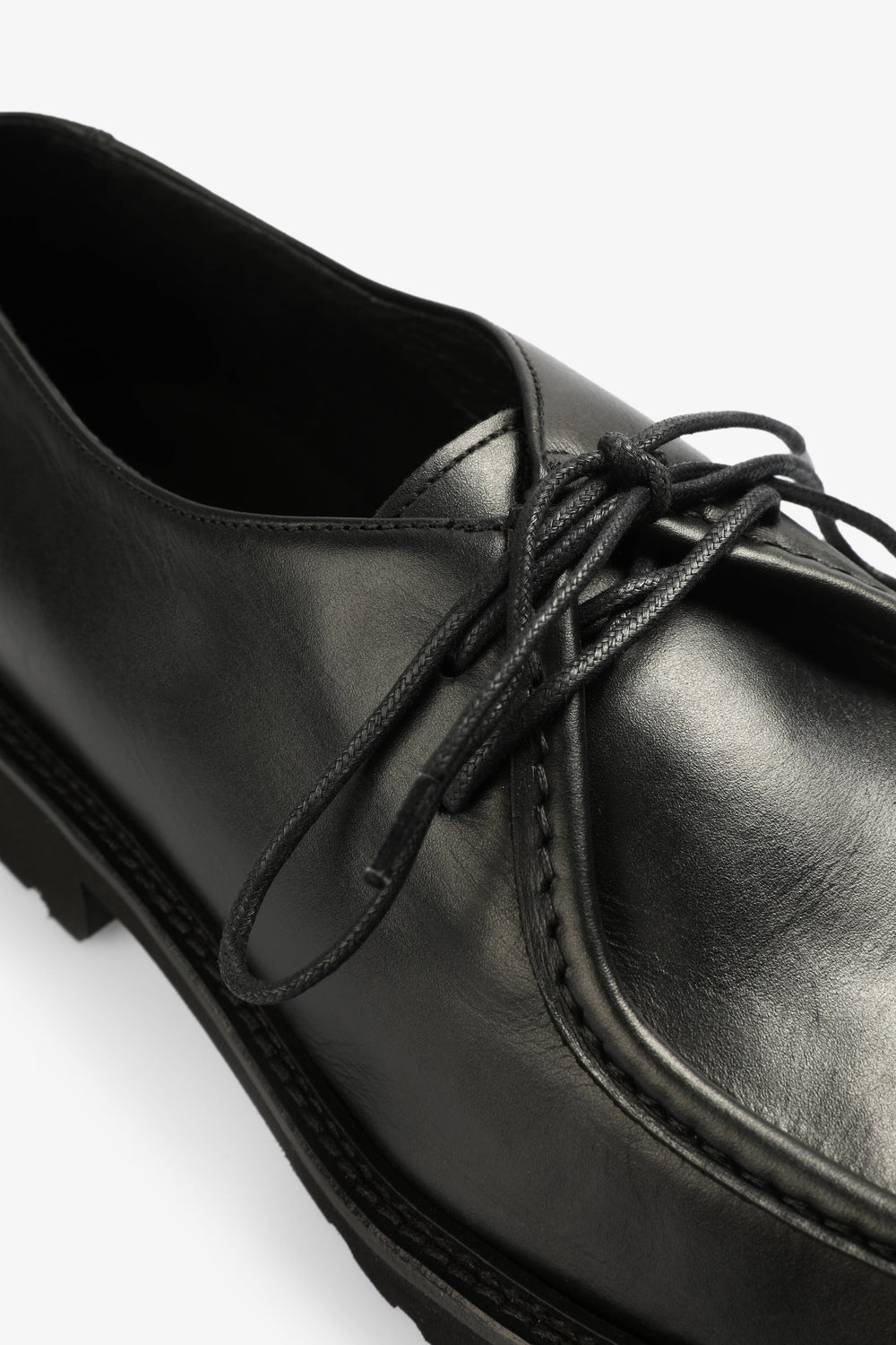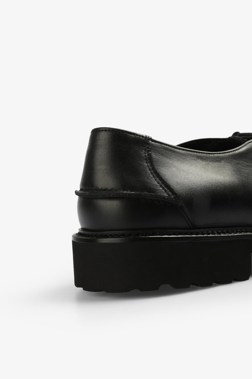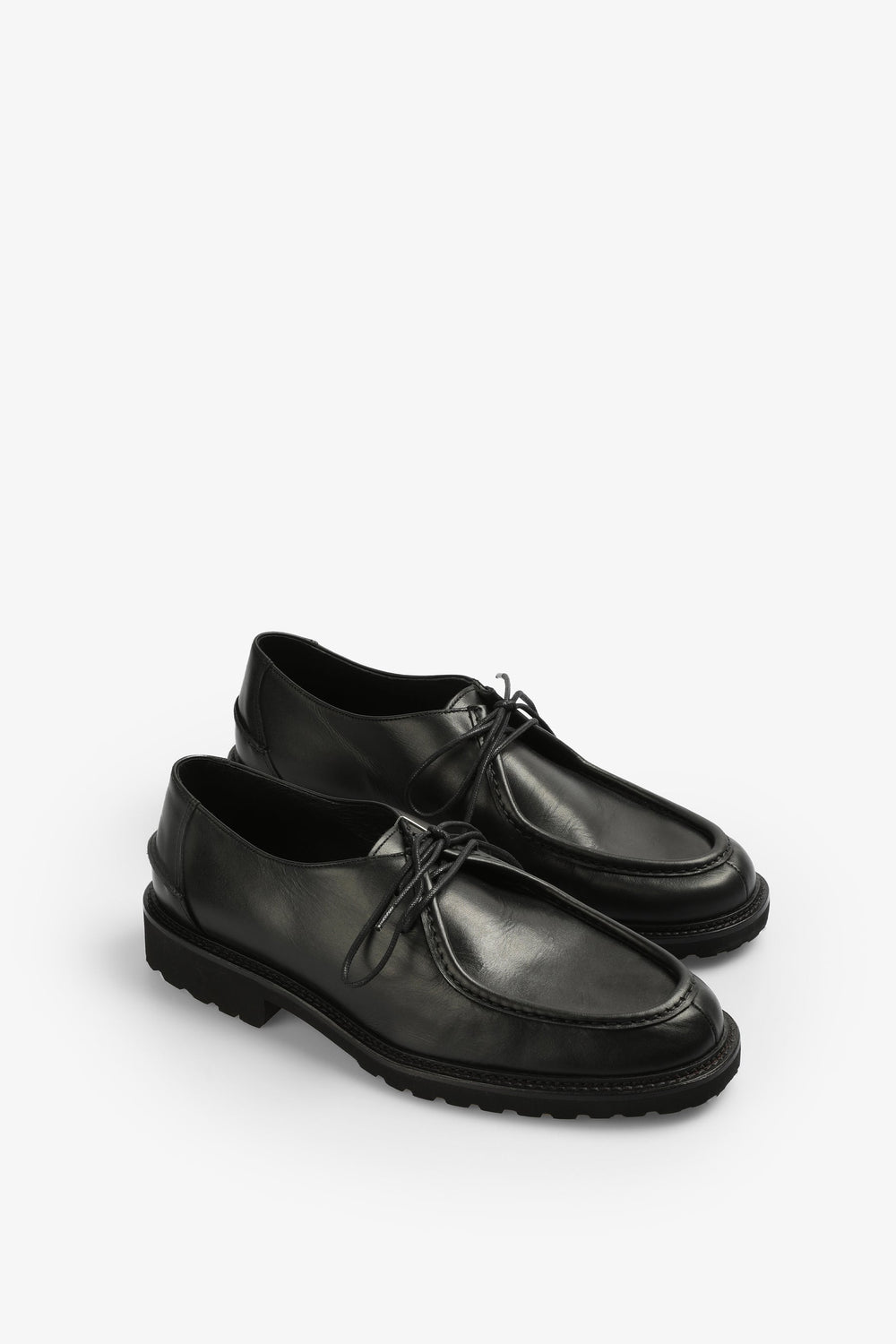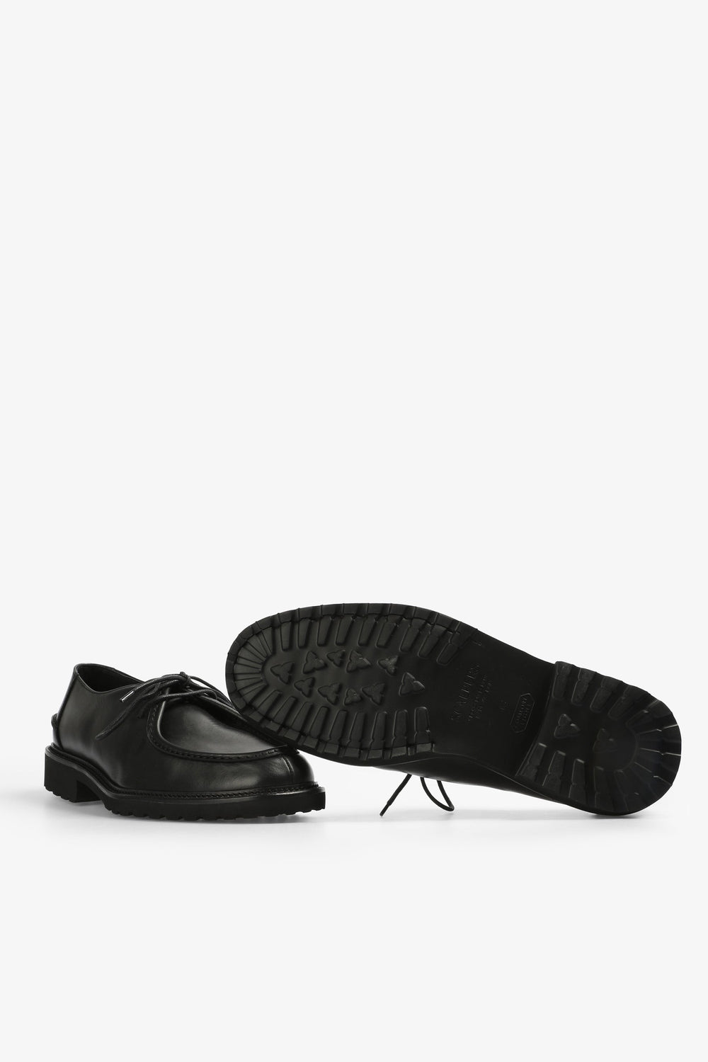 Zapatos tipo bordon confeccionados en 100% piel. Cierre con cordones y suela de goma dentada. Detalle de piping.