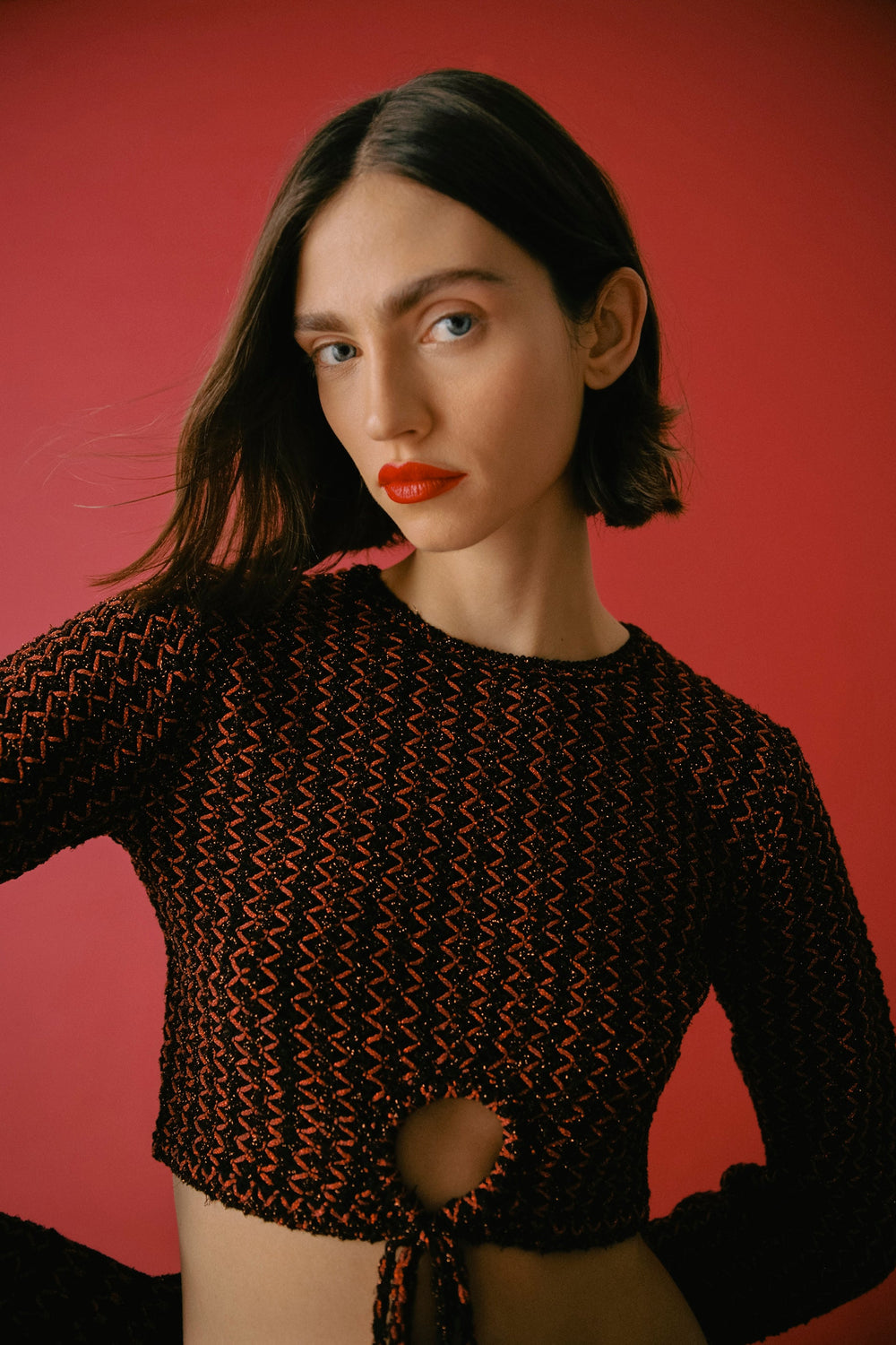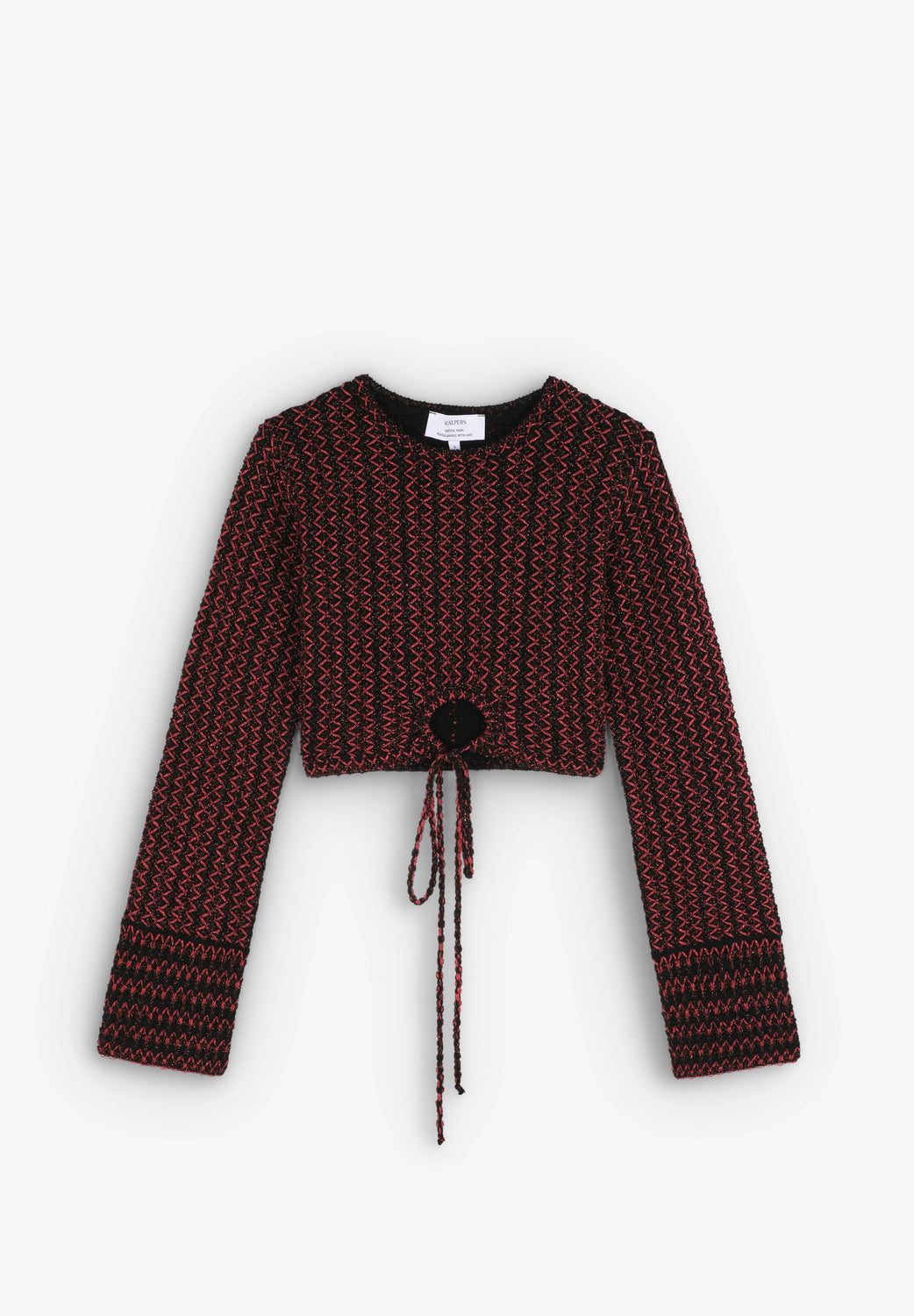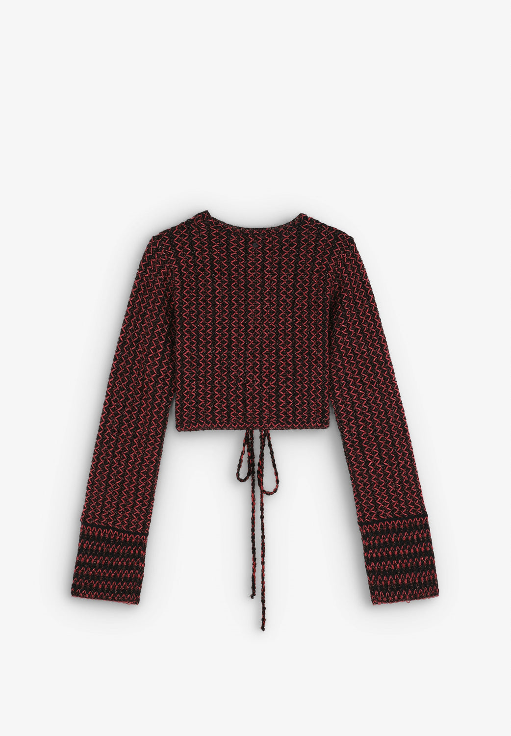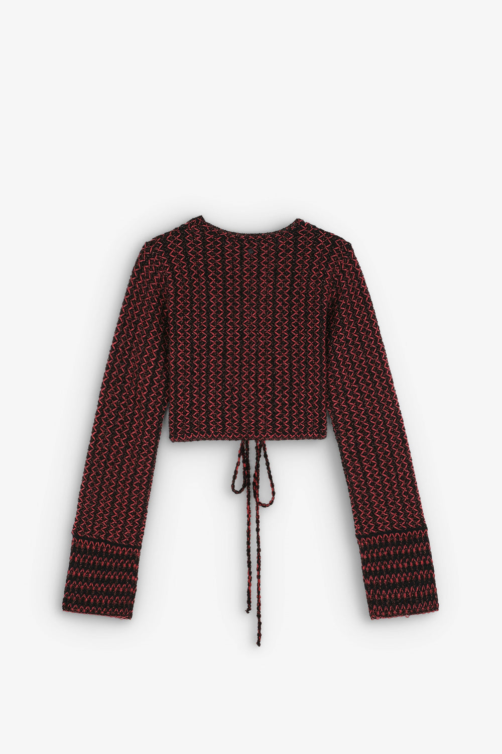Top cropped confeccionado en crochet. Slim fit, cuello redondo y manga larga. Detalle de abertura delantera con nudo.