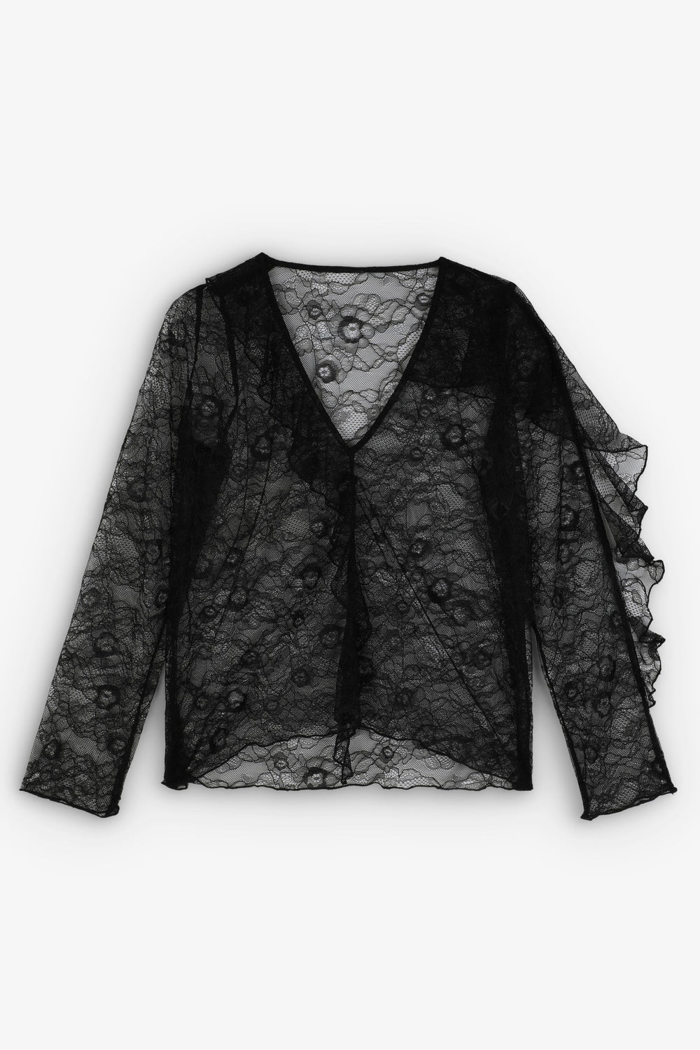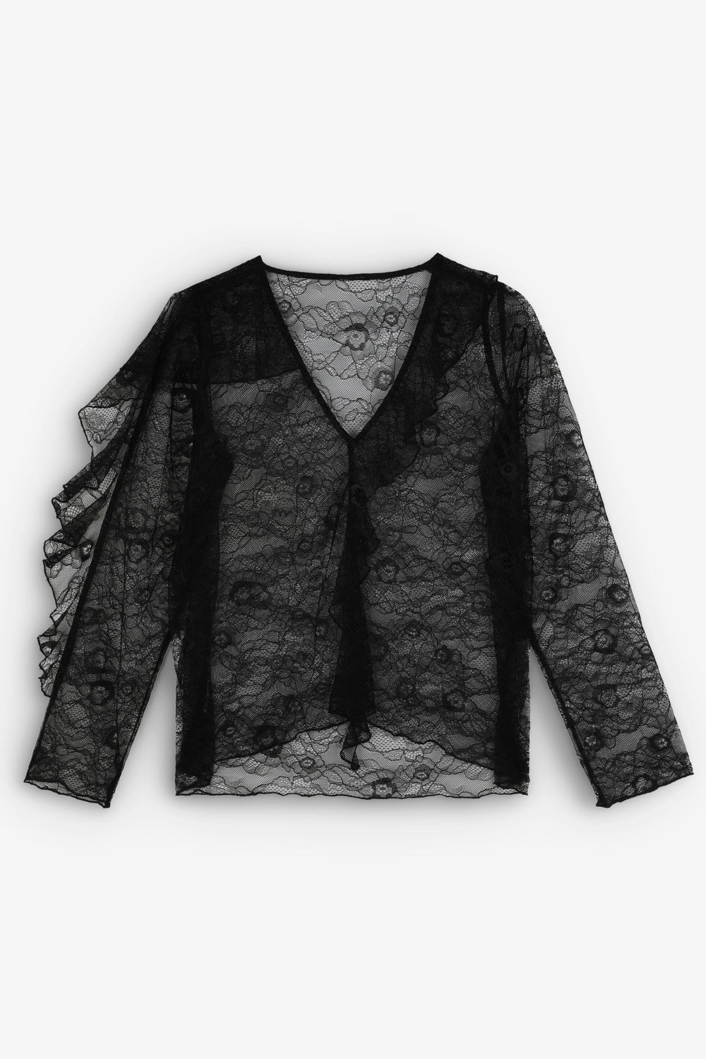 Blusa de encaje confeccionada en tejido semitransparente. Regular fit, escote de pico y manga larga. Detalle de volante en mangas.